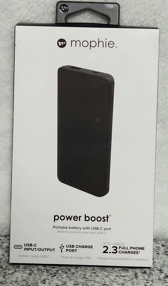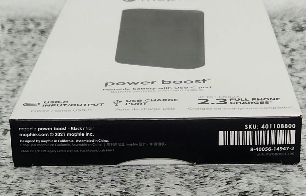 Introducing the Mophie Power Boost Portable Battery Charger, with a capacity of 10000mAh. This powerful charger comes with USB-A and USB-C inputs, allowing for fast charging of your Apple iPhone and Android USB-C devices. The charger is designed with a rugged finish, made from rigid plastic, and features LED lighting for added convenience. NEW With its wired/phone antenna port connectivity, this charger is perfect for those who are always on the go. It is compatible with a range of devices, including iPhones and Android USB-C models. The charger is made in China and comes with a range of features, including a durable design and a powerful charge.