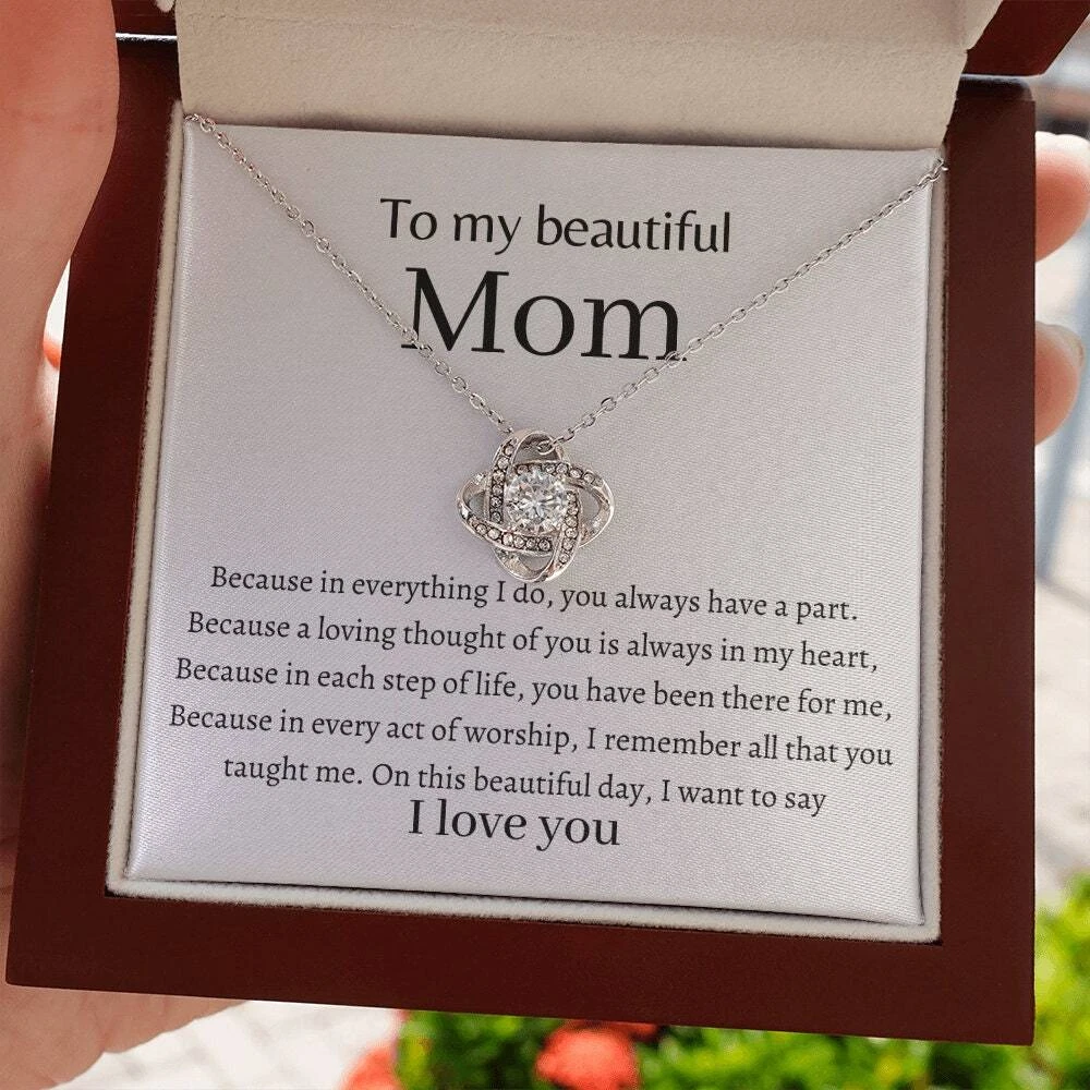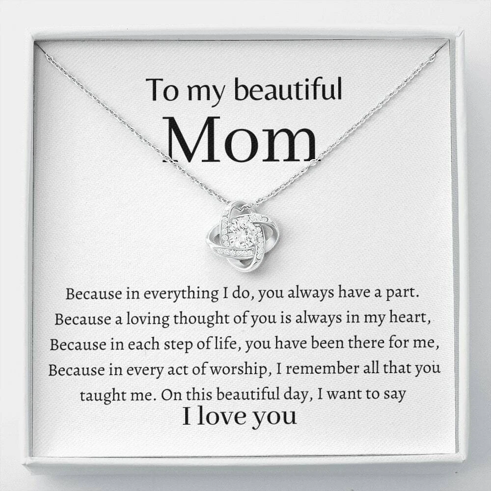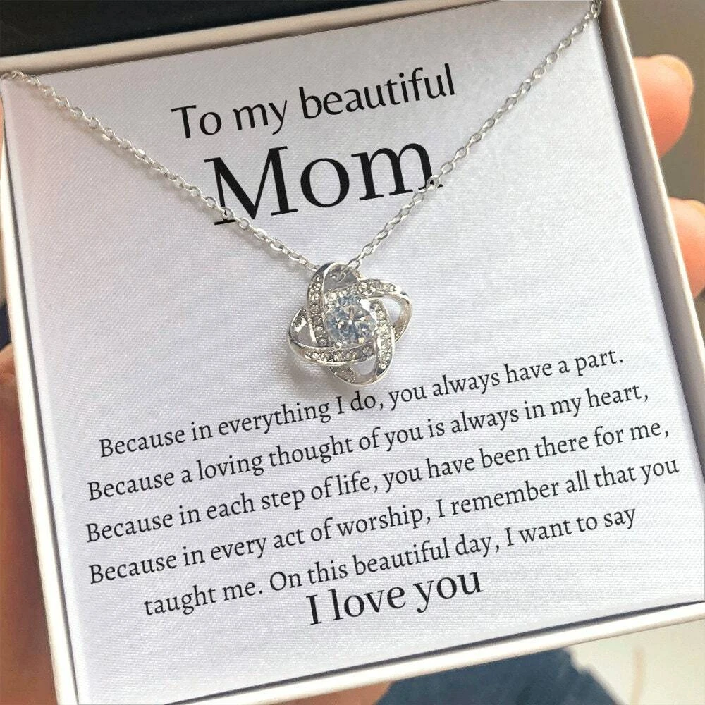 The Love Knot Necklace represents an unbreakable bond between two souls. This symbol of eternal love is a forever favorite and trending everywhere. Surprise your loved one with this gorgeous gift today! The beautiful Love Knot is crafted with brilliant 14k white gold over stainless steel, and swings from an adjustable cable chain, fastened securely with a lobster clasp. The center cubic zirconia crystal measures 6mm in diameter, and is surrounded with smaller cubic zirconia, showcasing added sparkle and shine to this gorgeous gift. You must see it for yourself! Specifications: 14k white gold over stainless steel 6mm round cut cubic zirconia stone 18"-22" adjustable cable chain necklace Lobster clasp attachment arab mother's day gifts, eid gift for mom, nikkah gift for mom, arabic mother day gift, eid necklace for mom, islamic wedding gift for mom, nikah gift, gift for muslim mom, mom eid gift, gift for arab mom, muslim mom gift, islamic gifts for mom, gift for muslim mom, gift for arab mom, muslim mom gift, Islamic Mother Quote, islamic mom jewelry necklace, mom nikah gift, gift for islamic wedding mom, muslim wedding gift for mom