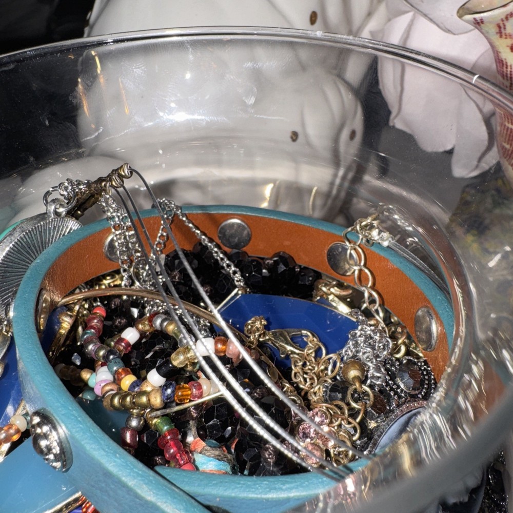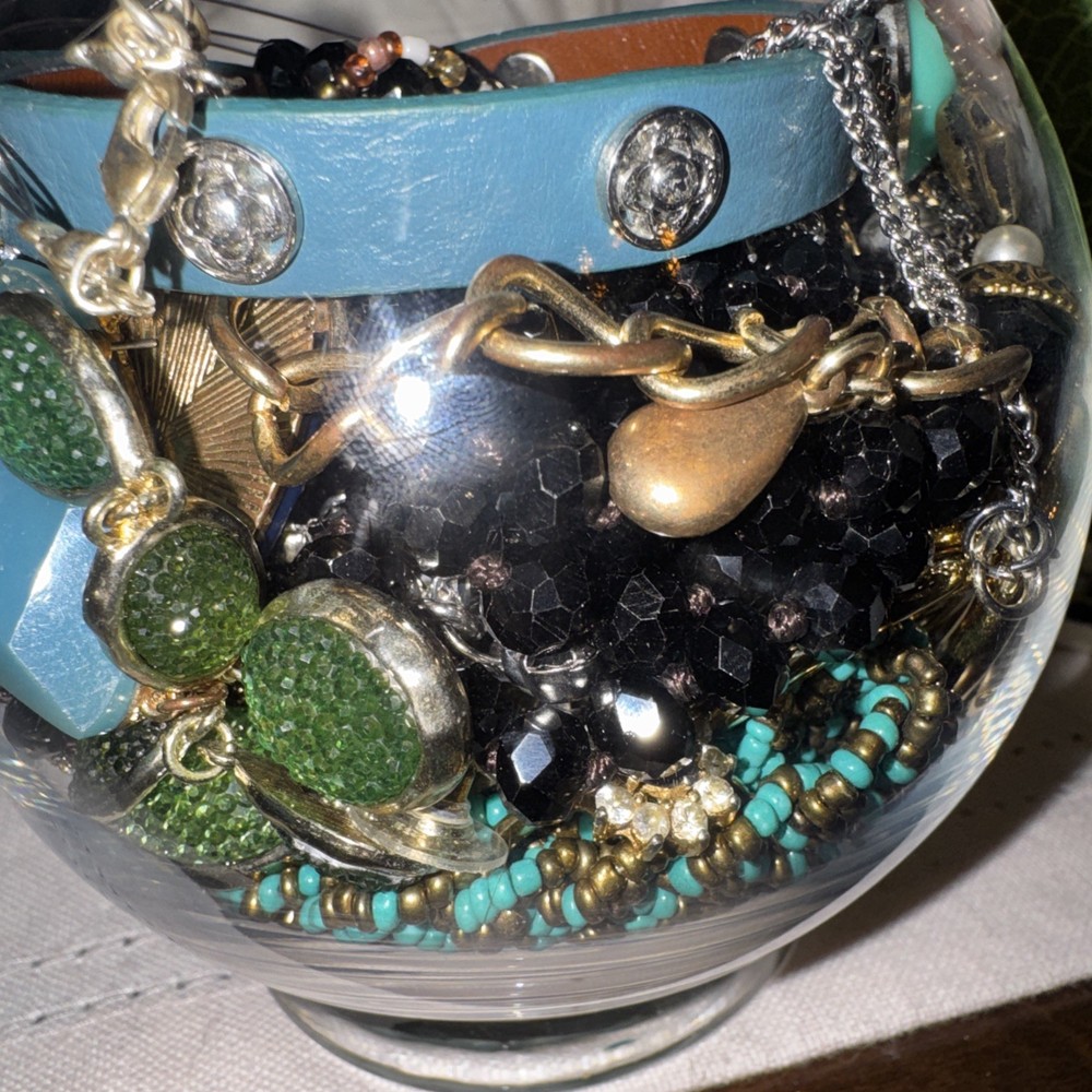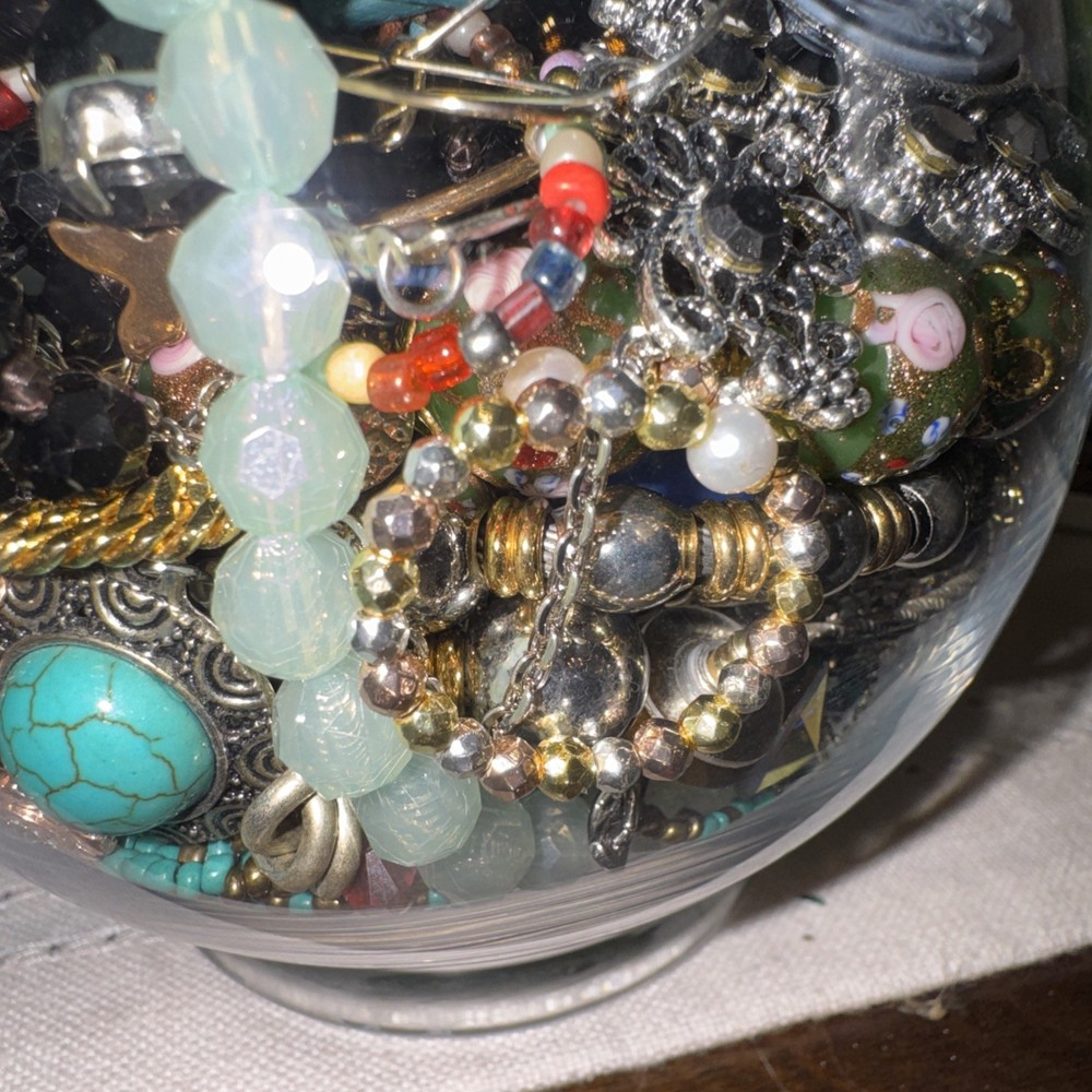 This jar is full of necklaces,rings,bracelets and earrings. All cleaned and wearable. From vintage to now. Jar is over 1 pound of fun exploring and wearing. Add to your collection.