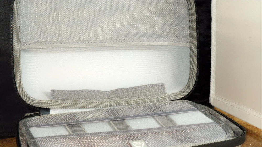 The Ninja Atomos V softshell case by Atomos is made of neoprene material and features an adjustable design. It is specifically designed to fit a Atomos display, providing protection and portability for the device.