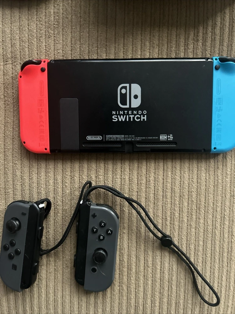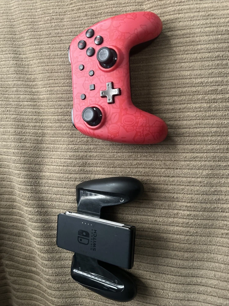 Nintendo switch in good condition with extra joycons, joycon controller, game controller, display deck, case, charger, and multiple games.