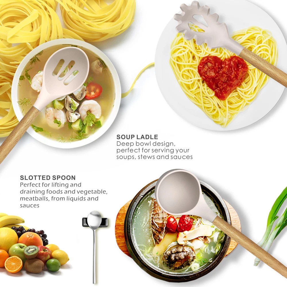 HEAT-RESISTANT, NON-MELTING, WOODEN HANDLE - The silicone cooking utensils can withstand temperatures up to 446°F, even if they are used in a high-temperature frying environment, they will not melt or produce smoke. The wooden handle feels comfortable prevents heat transfer, so you don’t have to worry about scalding the chef’s hands. These cooking utensils set is a good gift choice for mom. Note: Each handle has a slightly different color and texture SAFE, BPA FREE, FOOD GRADE SILICONE, ODORLESS - The kitchen utensil set are made of high quality food grade silicone.BPA free. no harmful smell. Note: It must be soaked for half an hour when it is used for the first time, and then exposed to the air for about 3 hours, the original smell of silica gel will disappear. The silicone cooking utensil is safe to use for any type of food. These kitchen utensil set does not react with food or beverages FULLY MEET THE NEEDS OF THE KITCHEN, NO MORE WASTE OF MONEY - These kitchen utensil sets include 9 cooking tools and 4 baking tools. A large utensil holder. Buy it at one time and get what you need in the kitchen. No more waste of money. Deep Soup Ladle, Solid Serving Spoon, Slotted Spoon, Flexible Spatula, Round Spatula, Pasta Server, Slotted Turner, etc. These silicone kitchen utensil perfectly protect the surface of the non-stick pan from scratches NO GAPS, NO FOOD IS CAPTURED, EASY TO CLEAN - Add stainless steel to each cooking utensil to maintain an initial optimal memory state. Never warp. And full of flexibility. One-piece molding without any gaps to capture food. Make cleaning easier. Because of the wooden handle, these kitchen tools are not suitable for dishwasher cleaning,but the small spatula, food tongs and utensil holder are dishwasher safe, As suggested on the packaging GIFT SELECTION AND RAPID AFTER-SALES RESPONSE - The silicone cooking utensils sets are an excellent choice for housewarming, wedding registry, and New Year gifts. We are committed to delivering speedy and supportive assistance to address any queries or concerns you may have. Feel free to contact us via the Walmart Buyer Page, and we will attentively listen and promptly respond within 12 hours