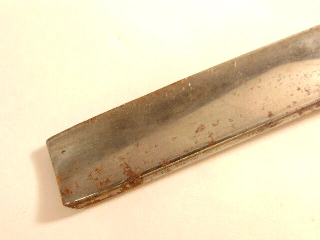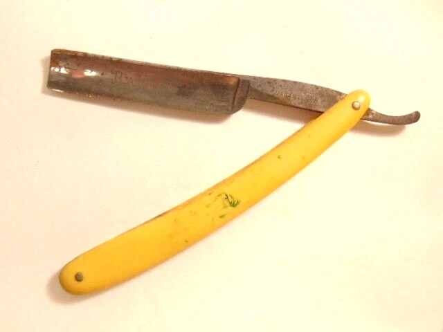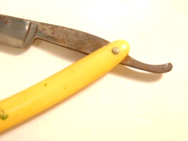 Here is a pre-owned old straight razor marked "Rattler" on the face of the blade and Germany near the rivet. The blade is also labeled "Welliver Hardware Co. Danville, PA". It measures about 6 inches long. The blade measures about 5 1/2 inches long and is about 5/8th inches wide. The razor shows some wear on the blade including staining and light corrosion on the blade and dirt on the yellow handle. Please see the pictures and ask any questions. Thank you for looking. (Inv 23,115)