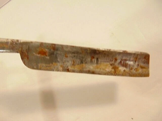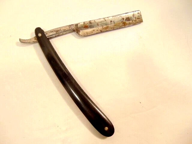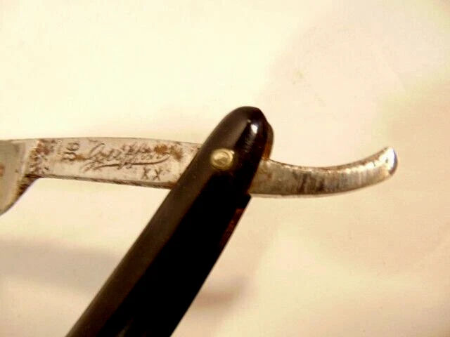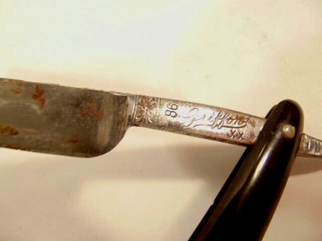 Here is a pre-owned older straight razor labeled "Griffon XX". The razor measures 6 1/8th inches long. The blade is about 5 1/2 inches long and 5/8th inches wide. The razor blade shows corrosion and wear. Please see pictures and ask any questions . Thank you for looking. (Inv 25,538)