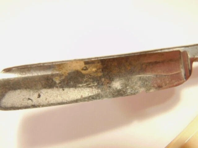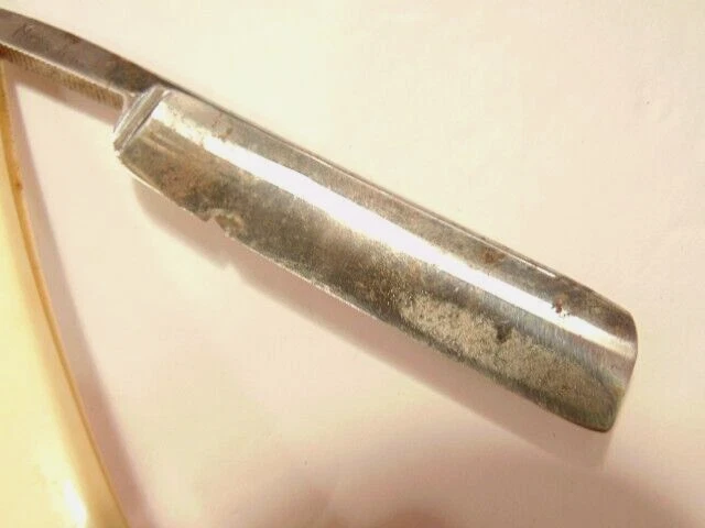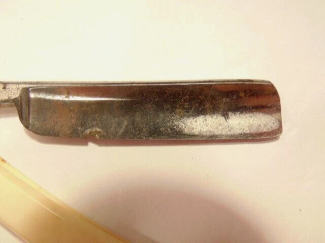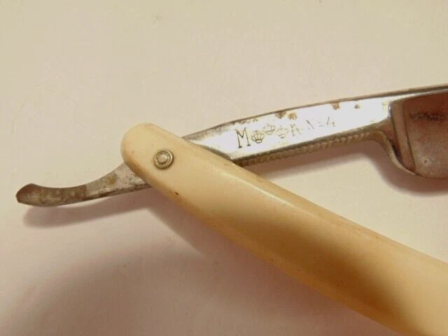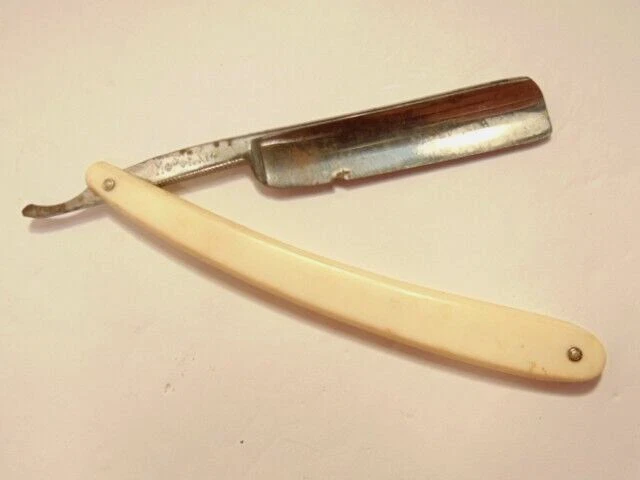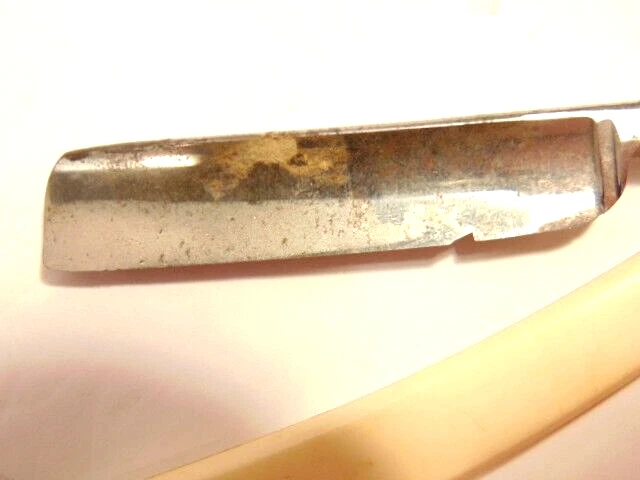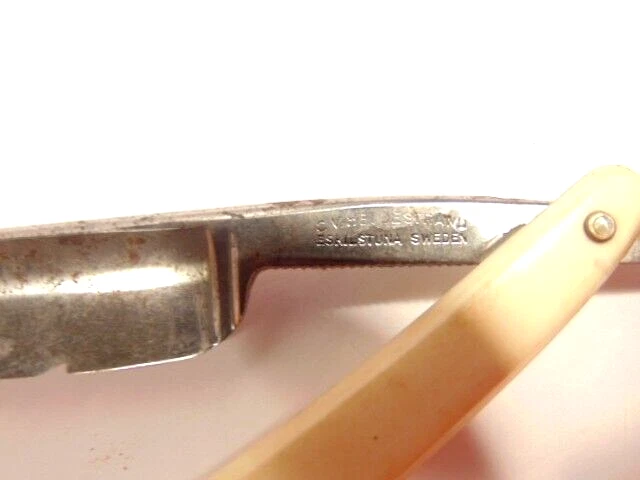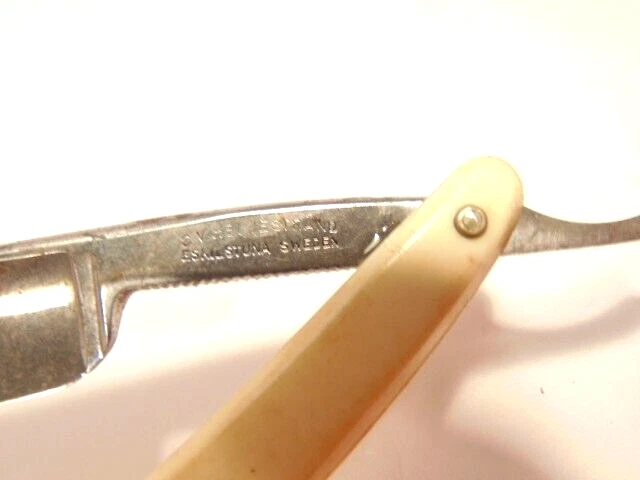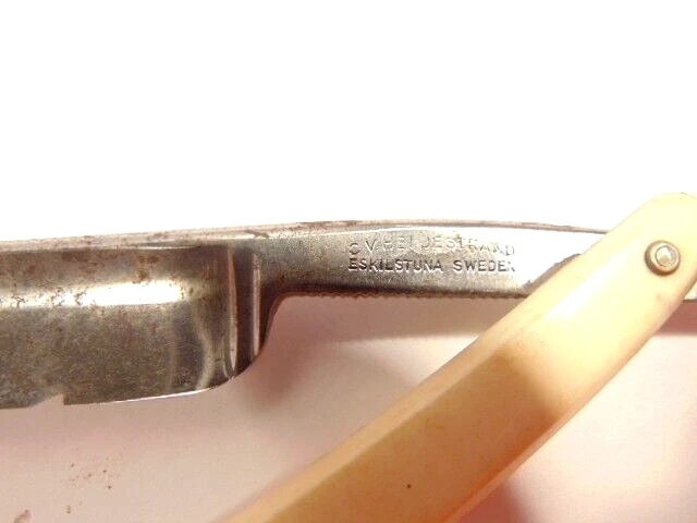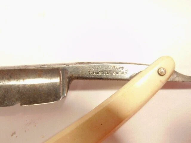Here is a vintage straight razor marked C.V. Heljestrand Eskilstuna Sweden. It has a white handle and measures about 6 inches from end to end when closed. The razor shows some corrosion, chips. dirt, staining and normal wear. Please see the pictures and ask any questions. Thank you for looking. (Inv A27,840)