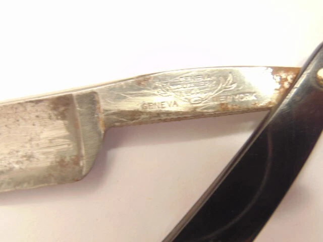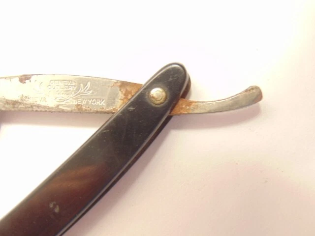 Here is a pre-owned older used Geneva Cutlery Co. straight razor. This is a usable razor but has been used and shows tarnish, dirt, wear including some scratches. The blade does not center well and needs guided into the groove. Please see the pictures and ask any questions. Thank you for looking. (Inv A27,245)