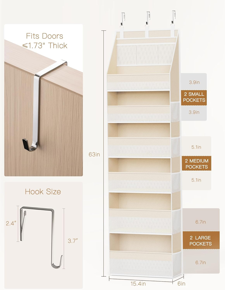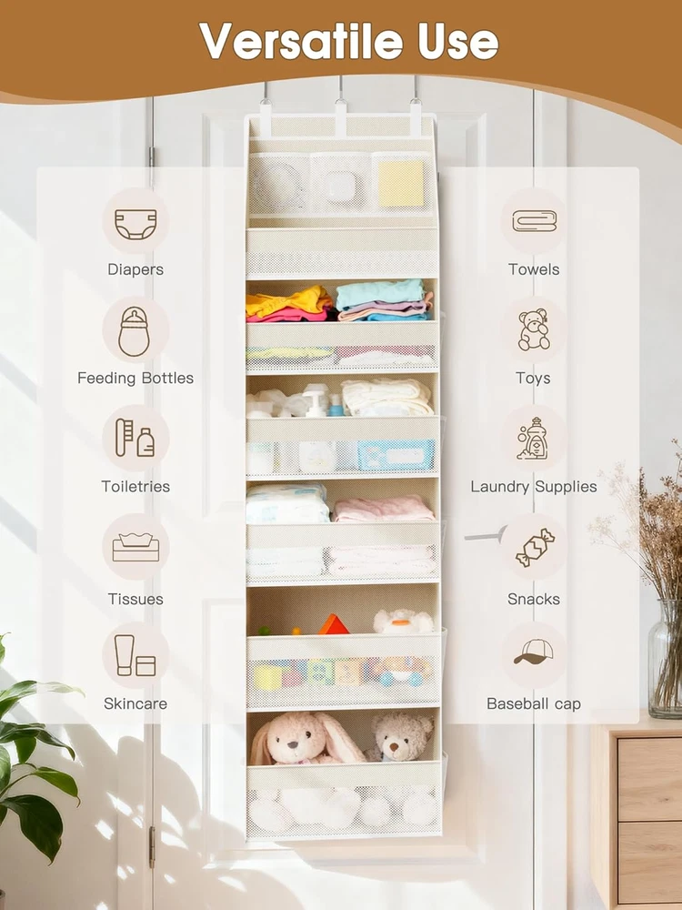 MAXIMIZE EVERY INCH OF SPACE: Turn any door into a powerhouse of organization! With 6 deep main compartments for towels, diapers, or clothes and 13 breathable mesh side pockets for small essentials like chargers, keys, and cosmetics, this over the door storage keeps everything perfectly sorted—goodbye clutter, hello stress-free mornings! BUILT TO LAST & NO-SAG DESIGN: Say goodbye to sagging shelves! Reinforced fiberglass rods, thick non-woven fabric, and sturdy PP boards hold up to 55 lbs, keeping your organizer straight and stable even when fully loaded. Precision stitching ensures long-lasting durability—you can count on it every day. SEE IT ALL AT A GLANCE: Stop digging through piles! Mesh-front panels give instant visibility and airflow, keeping items fresh, dry, and easy to find. this back of door organizer perfect for bathrooms, nurseries, laundry rooms, or anywhere you need fast access to essentials. MULTI-PURPOSE ORGANIZER: From bedroom doors to dorms, kids’ rooms, bathrooms, or nurseries—this door hanging organizer adapts to your lifestyle. Store toys, diapers, clothes, or accessories anywhere you need extra vertical space. Declutter your home in style! HASSLE-FREE SETUP & COMPACT STORAGE: No tools, no stress—just hang with included hooks and insert the support boards. Instantly ready to organize! When not in use, it folds flat for easy, space-saving storage. Product description 1 Nursery 2 Bathroom 3 Pantry 4 Bedroom 5 RV