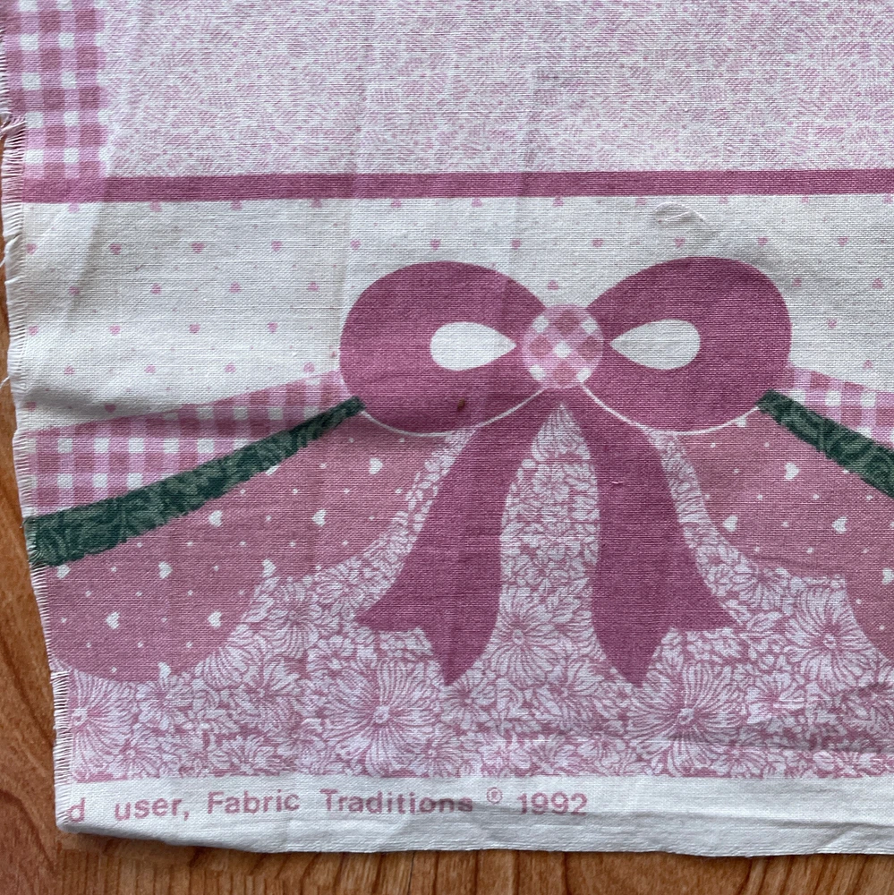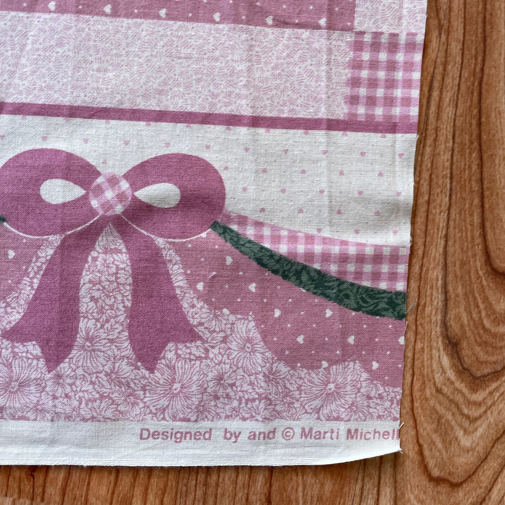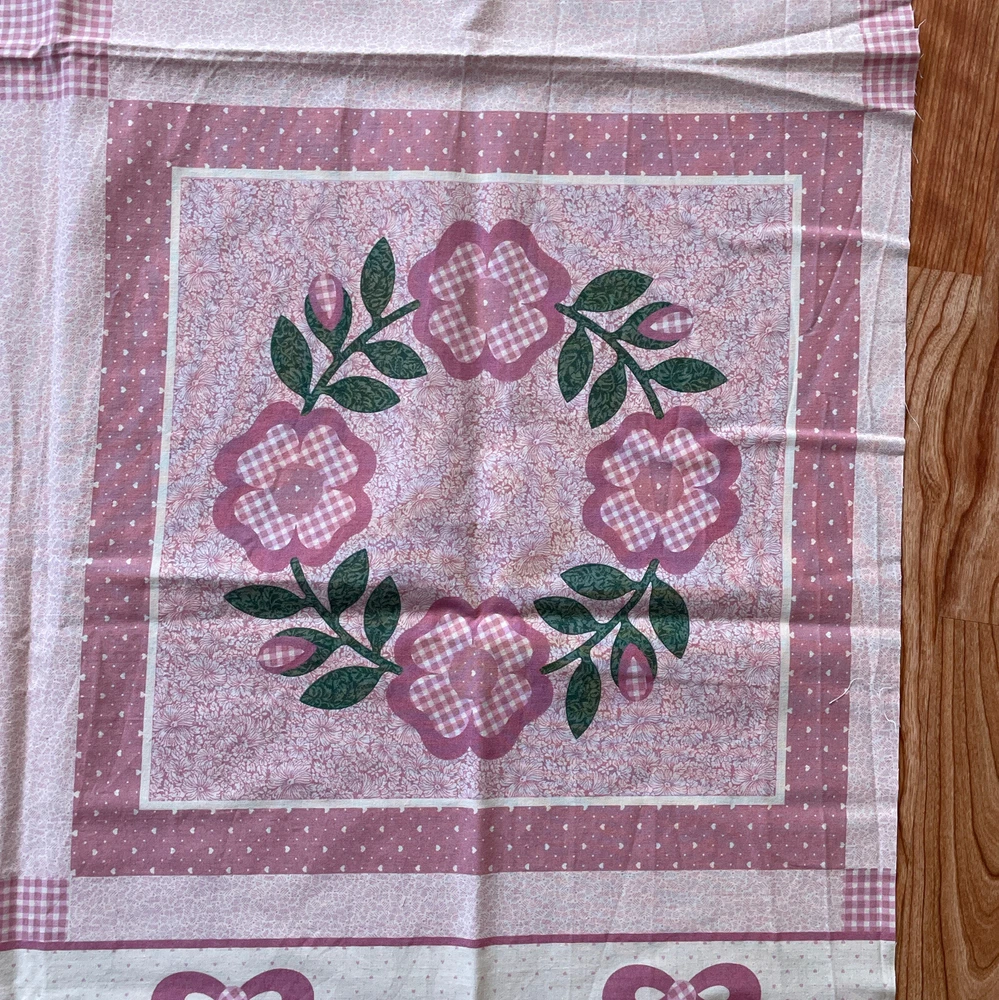 pink floral wreath heart patchwork panel marti mitchell. Comes as shown. Has been prewashed. Each square measures about 15”x15”. Entire panel measures 35”x44”