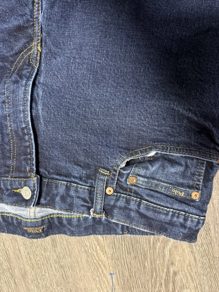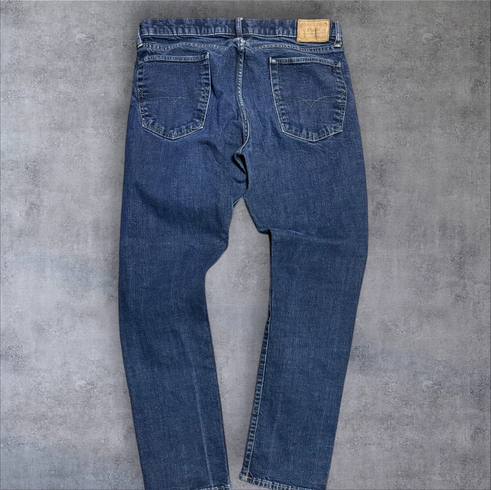 These are Polo Ralph Lauren men's jeans in size 36 with a 34-inch inseam. The jeans are in a blue color and made of cotton denim. They have a slim fit and a straight style, with a vintage look. The brand is Polo Ralph Lauren and the model is Varick Slim, part of the Ralph Lauren Varick product line.