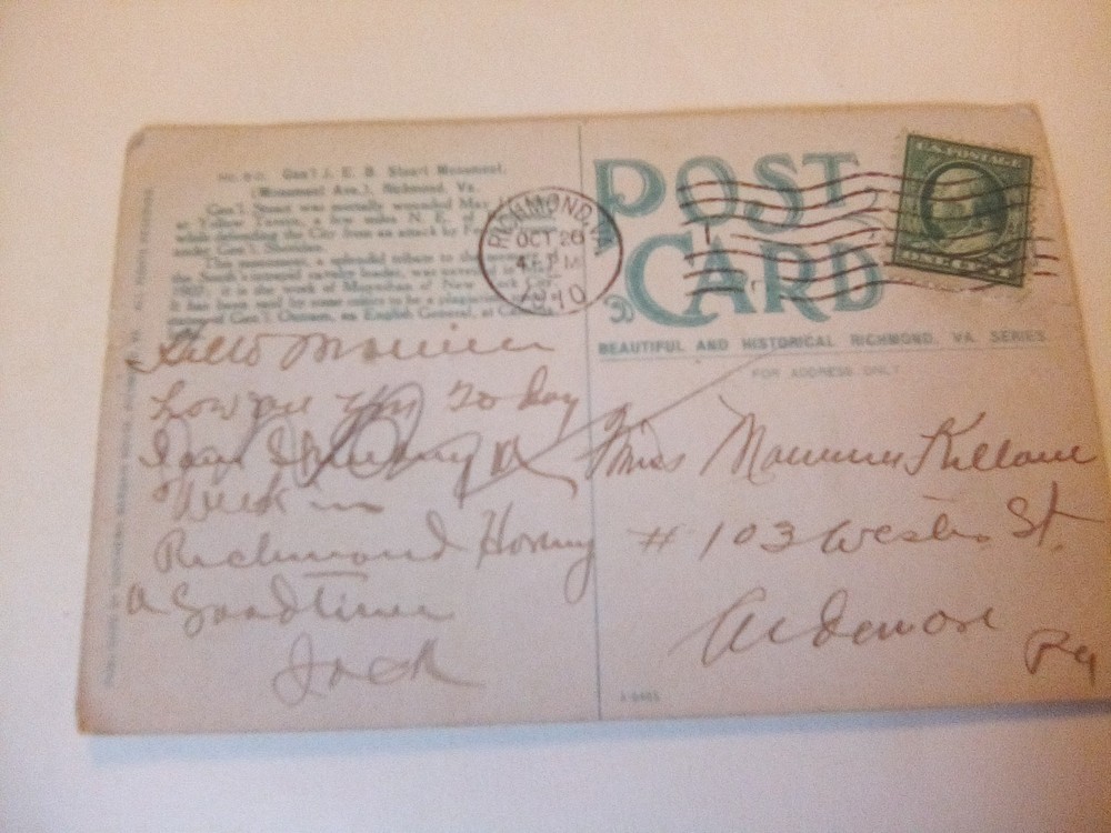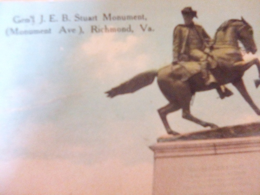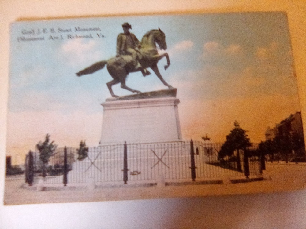 The product is a vintage postcard featuring the General J.E.B. Stuart Monument on Monument Ave. in Richmond, Virginia. The postcard was posted in 1910 and measures the standard size of 5.5 x 3.5 inches. It is an original lithograph printed by Southern Bargain House in Richmond, Virginia, showcasing a historic subject in North America, specifically in the United States during the time period of Civil War. This single unit postcard provides a glimpse into the history and landmarks of Richmond, Virginia in the late 19th century.