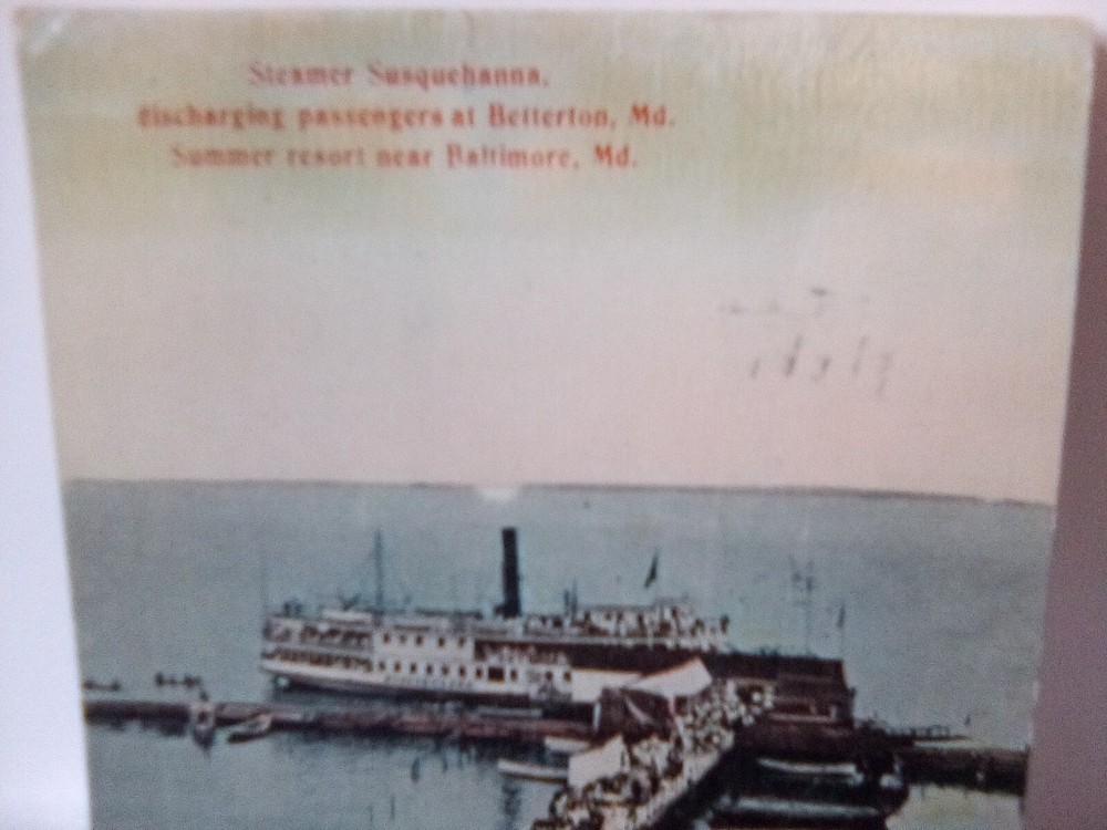 The product is an original printed postcard from 1910 featuring the Steamer Susquehanna discharging passengers at Betterton, Maryland. Published by Chessier Company in Baltimore, the postcard depicts a scene of a steamship passenger ship in a summer resort near Baltimore, MD. Measuring at a standard size of 5.5 x 3.5 inches and posted in 1910, this collectible piece of topographical postcard captures a piece of North American history during the Divided Back era.