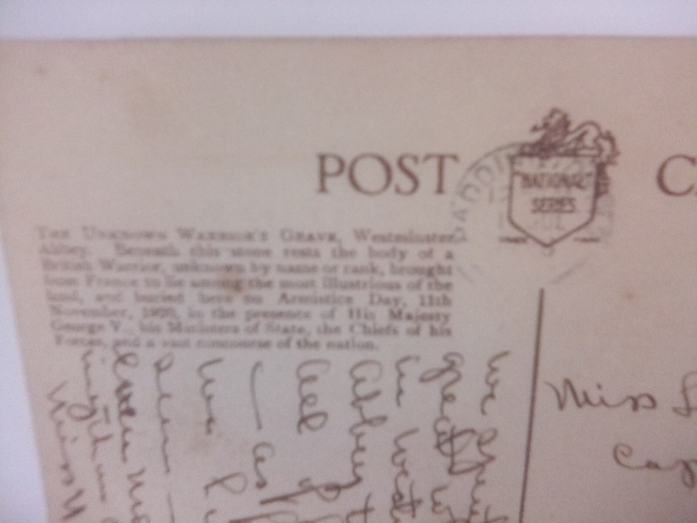 The product is a real photo postcard featuring the Unknown Warrior Grave at Westminster Abbey in London. It was posted in 1928, during the divided back era. The postcard showcases a landscape of the famous place, with the theme of historical figures and militaria. Made in England, specifically in Westminster Abby, this postcard captures a significant aspect of British history and is a collector's item for those interested in topographical postcards and historical memorabilia.