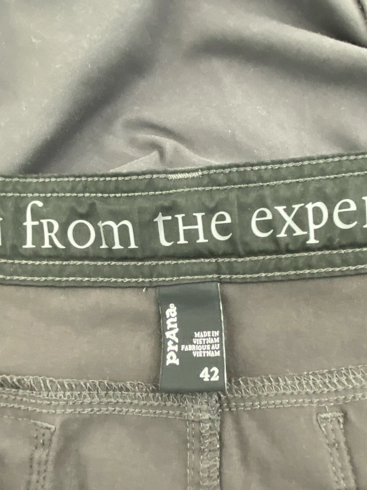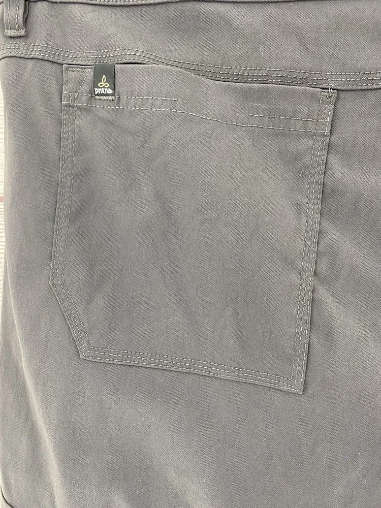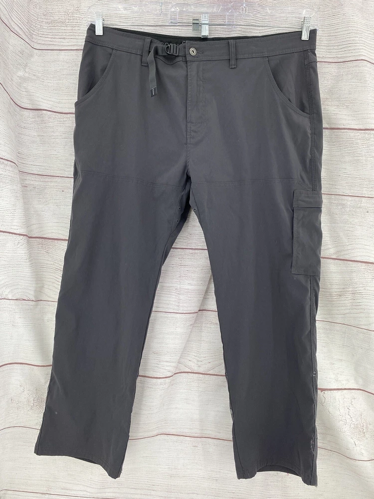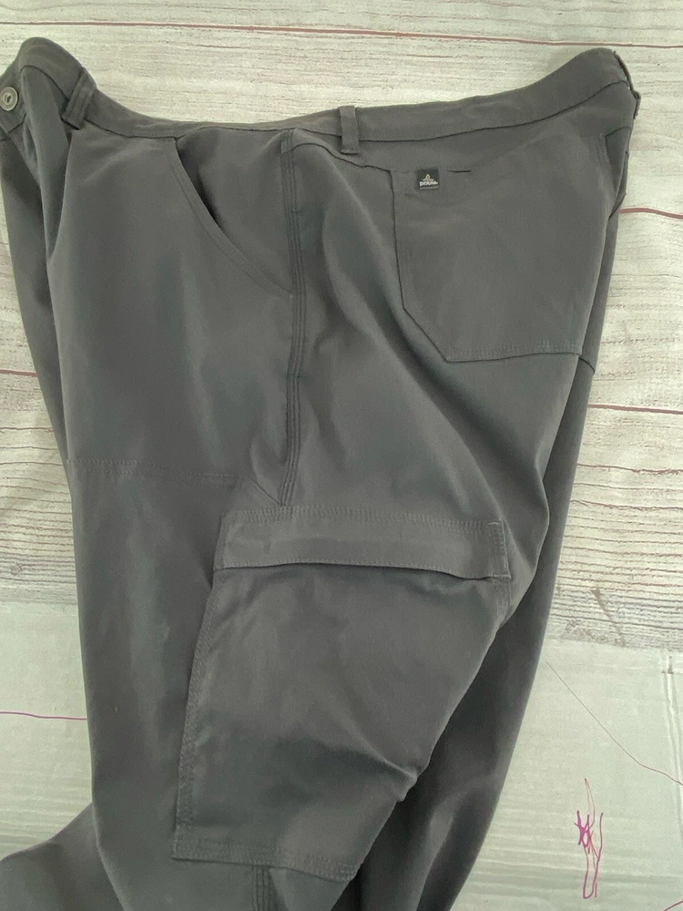 Closure: Button, Zip Accents: Logo Season: Fall, Spring, Summer, Winter Style: Cropped Vintage: No Theme: Logo, Nature, Outdoor Fit: Regular Rise: High (Greater than 12 in) Inseam: 29 in Pocket Type: Cargo Pocket Size: 42 Pattern: Solid Color: Gray Features: Adjustable Waist, Belted, Breathable, Comfort, Pockets, Stretch Waist Size: 43 in Department: Men Front Type: Flat Front Brand: prAna Size Type: Regular Garment Care: Machine Washable Material: Nylon, Elastan Occasion: Casual, Travel, Workwear Leg Style: Straight Type: Pants Fabric Type: Microfiber