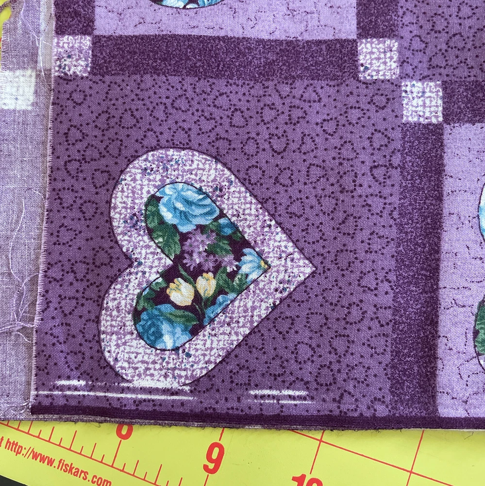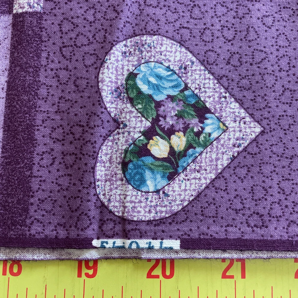purple heart block blue floral rose patchwork cheater 1.6 yards. Hard to make out maker name; possibly fabri quilt? Comes as 1.6 yards; 60”. Each block measures about 4”x4” has a print flaw on one of the last squares(last picture).