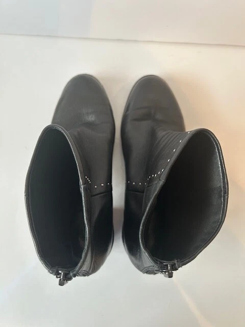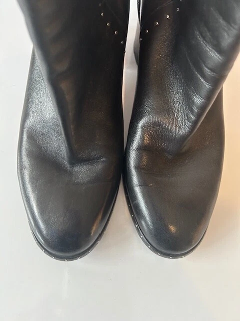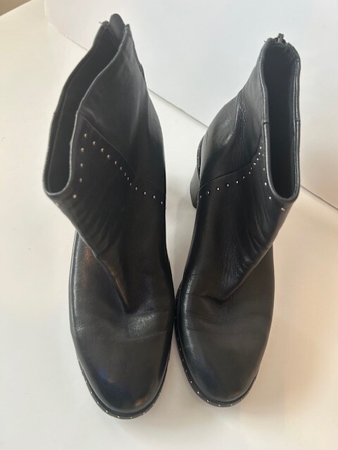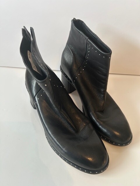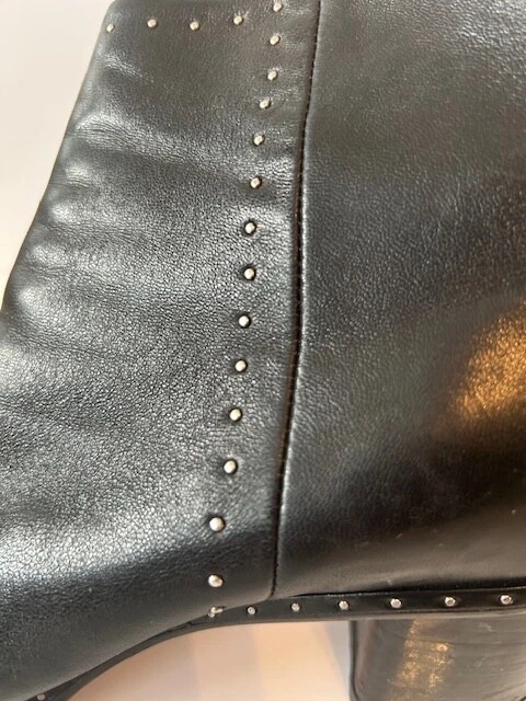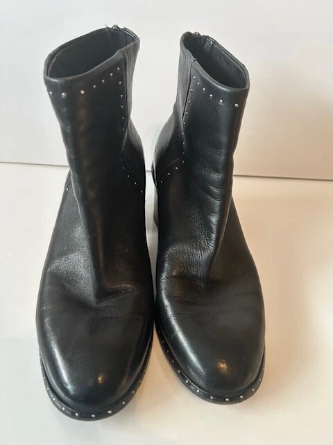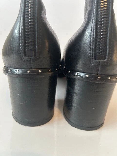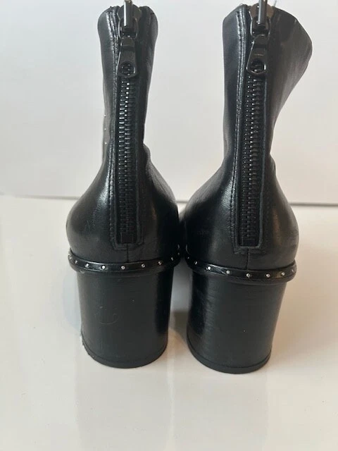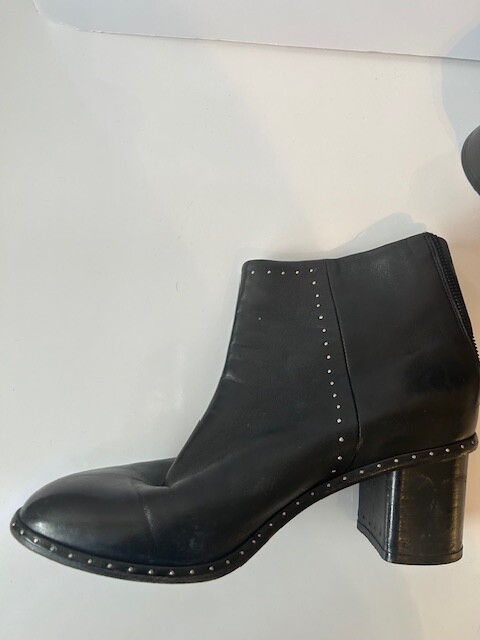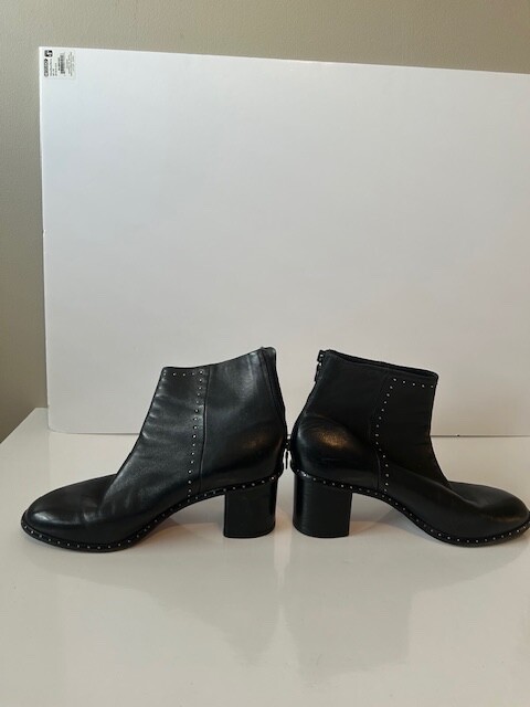 These rag & bone Black Leather Women's Moto Studded Ankle Boots, made in Italy, are a stylish addition to any wardrobe. Featuring a mid heel height and a block heel style, these booties are perfect for adding a touch of edgy sophistication to your outfit. Back zip closure .The leather upper, lining, and insole provide both durability and comfort, while the studded accents add a trendy flair. With a zip closure for easy on and off, these boots are a must-have for any fashion-forward woman.