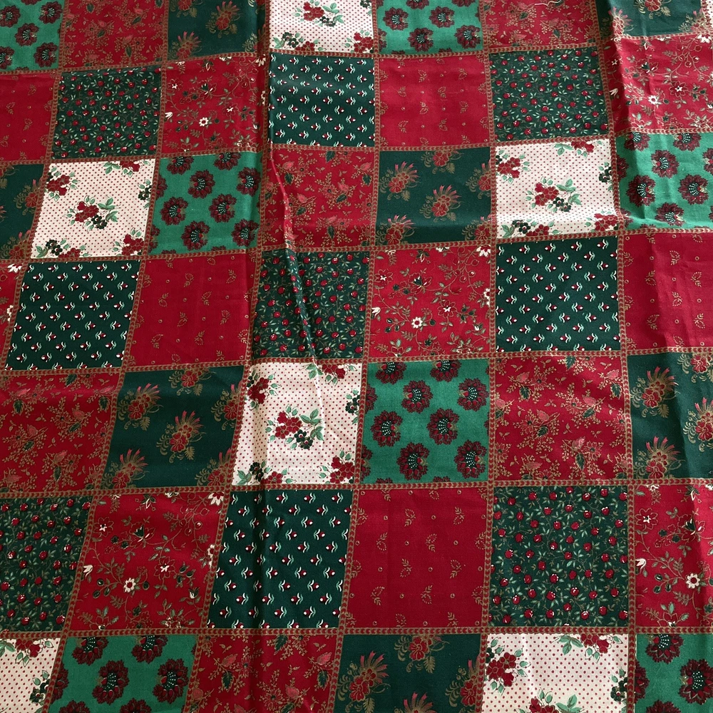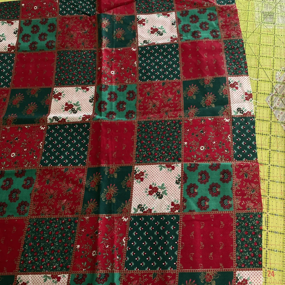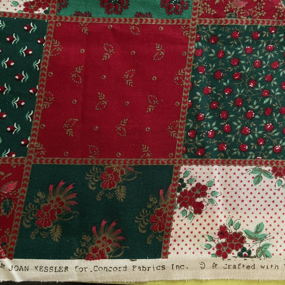 red green cream floral flower patchwork cheater joan kessler 1 yard. Comes as a little over a yard; 38”. Pattern is off centered and not straight with pattern. Has a slight musty odor.