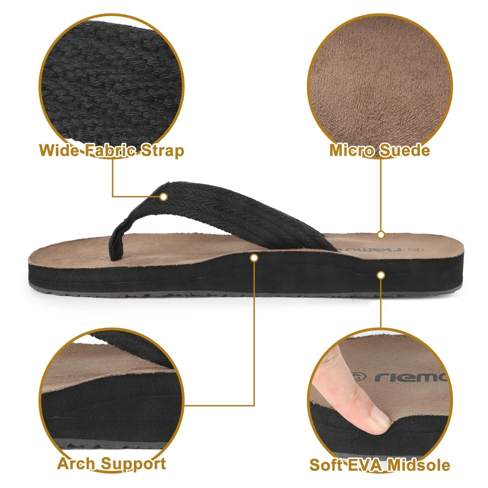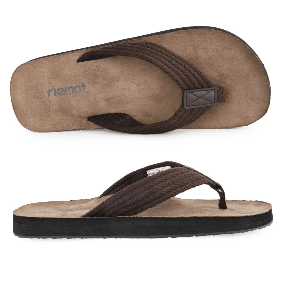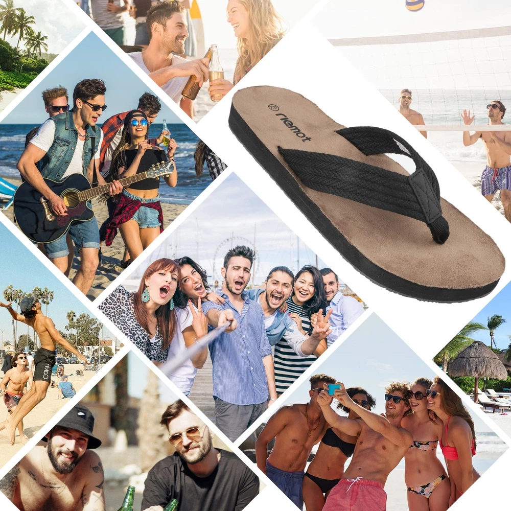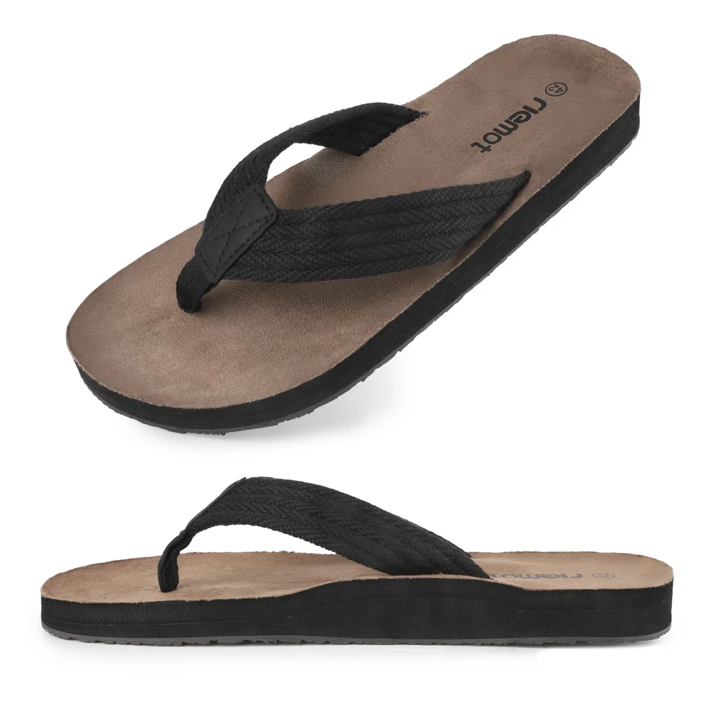 riemot Men's Thongs Arch Support Flip Flops Beach Sandals Lightweight Comfort Thongs The riemot Men's Thongs Arch Support Flip Flops are lightweight and comfortable sandals perfect for casual occasions. Featuring a slip-on closure and solid pattern, these sandals have a rubber outsole for non-slip performance. The synthetic upper and lining materials ensure durability and breathability, while the cushioned insole provides extra comfort. With arch support and a lightweight design, these thongs are ideal for outdoor activities during the summer, fall, or spring seasons. The riemot brand logo adds a stylish touch to these versatile beach sandals. SUPPORT&DURABILITY:riemot mens flip flops are sturdily constructed and breathable. The soft suede insole and arch support make this sandals men very comfortable. This flip flop slippers is designed to provide all-day support and cushioning with every step PREMIUM&EXCELLENT TRACTION:Premium TPR soles add to the durability of the flip-flops, and the slip-resistant rubber soles with a pronounced tread pattern provide excellent traction and stability on a variety of surfaces and terrains COMFORTABLE CANVAS STRAP: Optimised soft canvas strap provide a comfortable feel against your skin. We've optimised the toe area of the flip-flops to provide more room for your toes and ensure they are wide enough. Wear them whenever you want your feet to relax MADE FOR YOU: The classic flip flop sandals are spacious and comfortable and fit your feet firmly, giving you endless fun both indoors and outdoors. Suitable for spring, summer and autumn, especially for summer EASY CARE & VERSATILE: riemot 3 Point Flip Flops are ideal for everyday casual slippers, beach slippers, pool slippers and indoor and outdoor sandals. They are also easy to clean. Rinsing the flip flops with fresh water after travelling will make them more durable