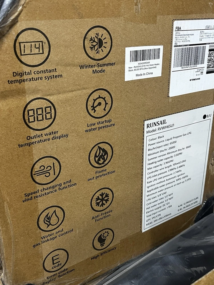 Runsail tankless water heater for RV. Propane, 12 volt, remote control, digital readout, 65,000 BTU, black in color.
