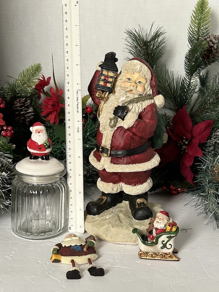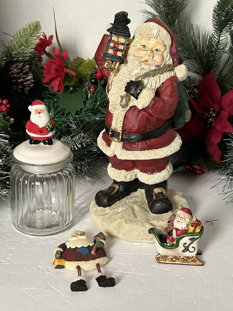 Lot includes large Santa, Santa jar, Santa magnet and adorable small Santa in a sleigh. Good condition