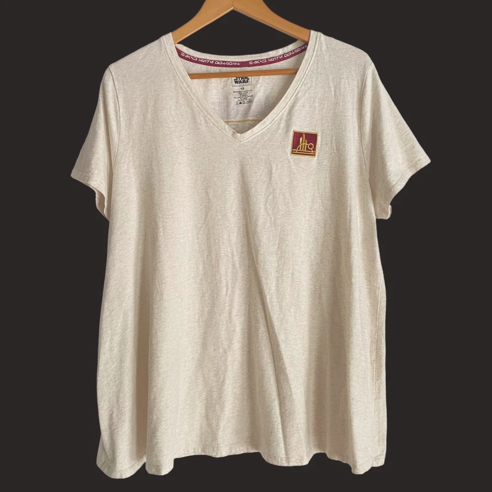 size 1x womens Star Wars Galaxy's edge black spire outpost v-neck tee t-shirt 95% cotton, 5% elastane Great condition. Little to no fade, minimal wash wear, no stains length: 28" armpit width: 23.5" disney star wards, disney, star wars, lucasfilm, star wars tee, black spire, black spire outpost, 1x, size 1x, star wars tshirt, tshir,t t-shirt, star wars t-shirt