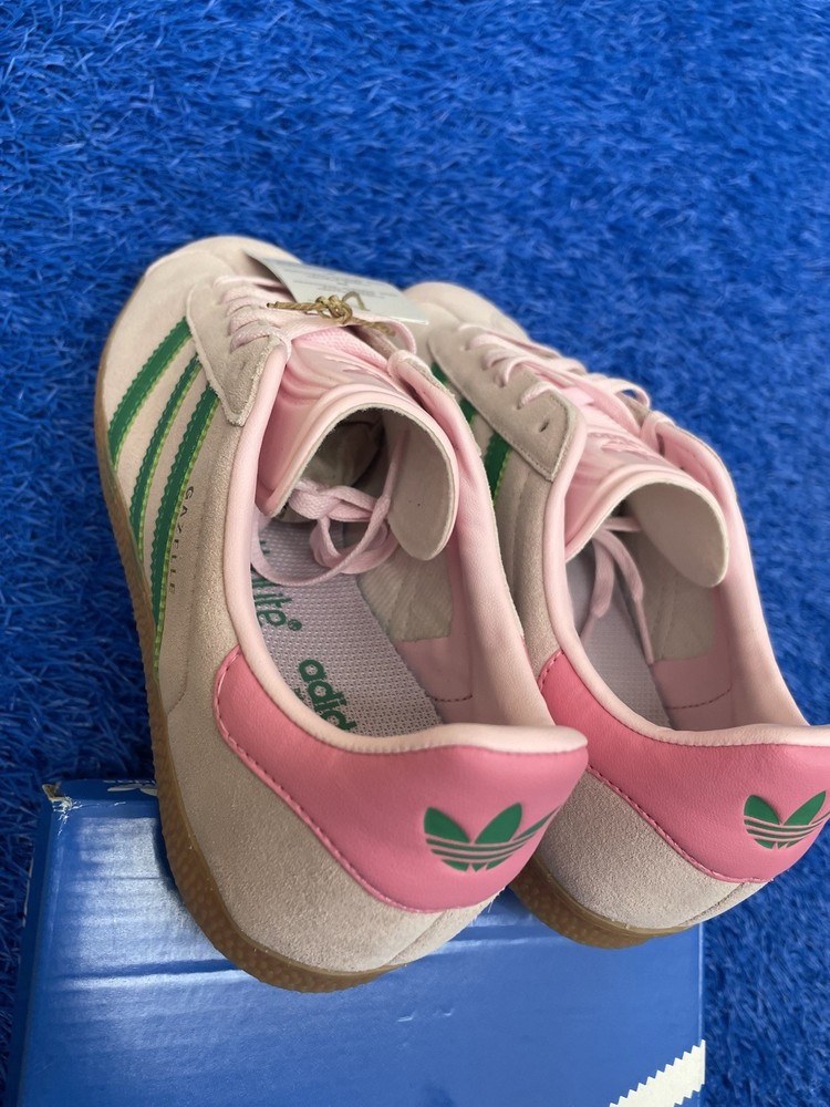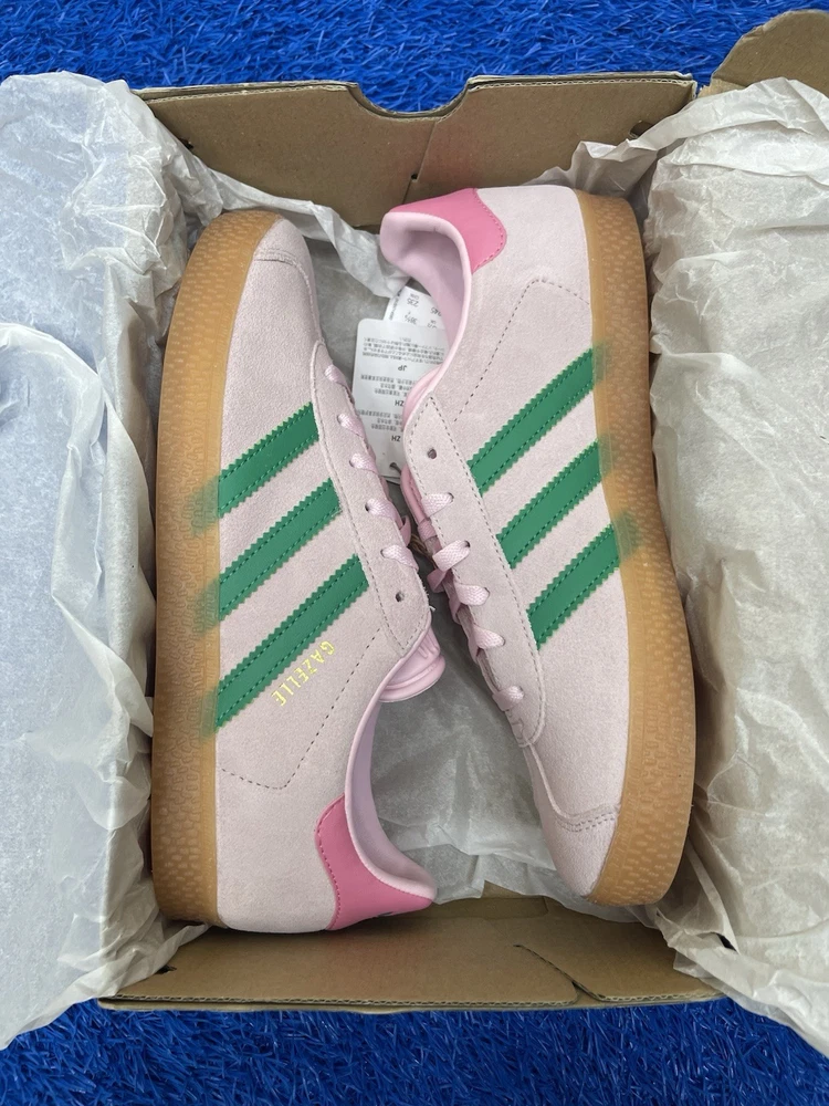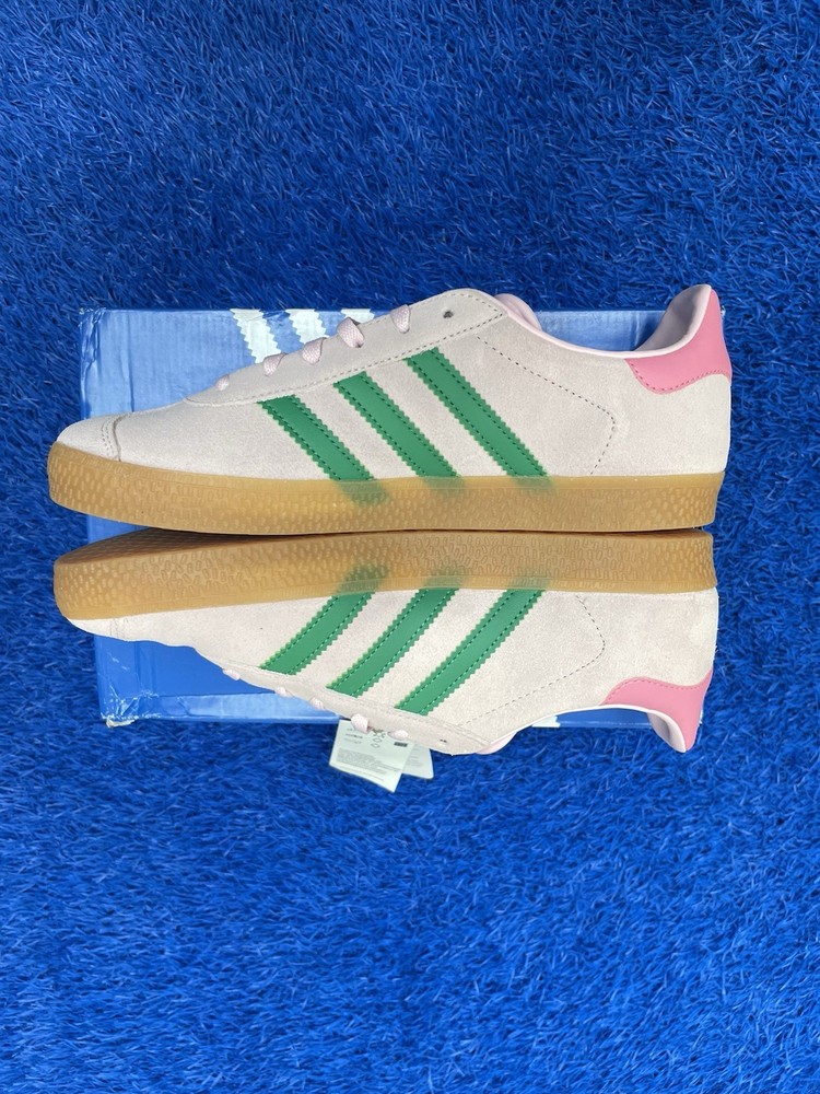 The product is a pair of Adidas Gazelle J Clear Pink Court Green Youth Kids sneakers in size 6Y. These low-top lace-up shoes feature a solid pink color with a logo accent. Made with suede upper material and a rubber outsole, they are designed for athletic activities, suitable for activewear occasions. The Gazelle Shoes Kids model is part of the Adidas Gazelle product line and is recommended for unisex kids in the summer, fall, and spring seasons. Made in Indonesia, these sneakers offer both style and comfort for young wearers.
