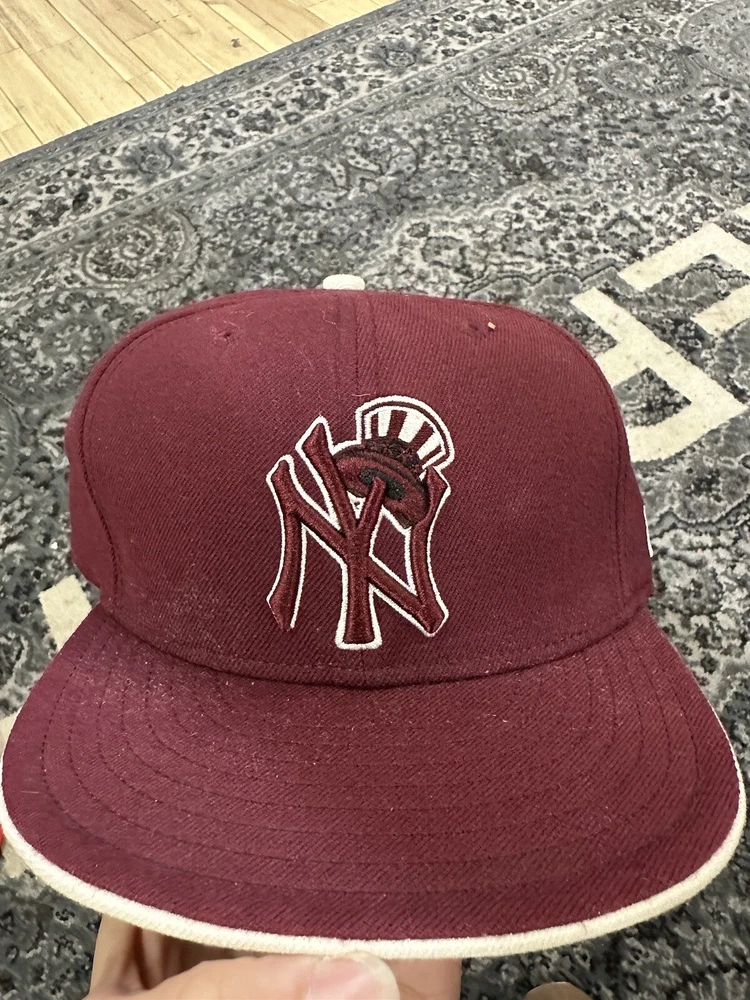 preowned. 7/10 worn condition. slight dirt/aging on hat/ inside hat/under brim. hat creasing. rare finds. see pics for more.