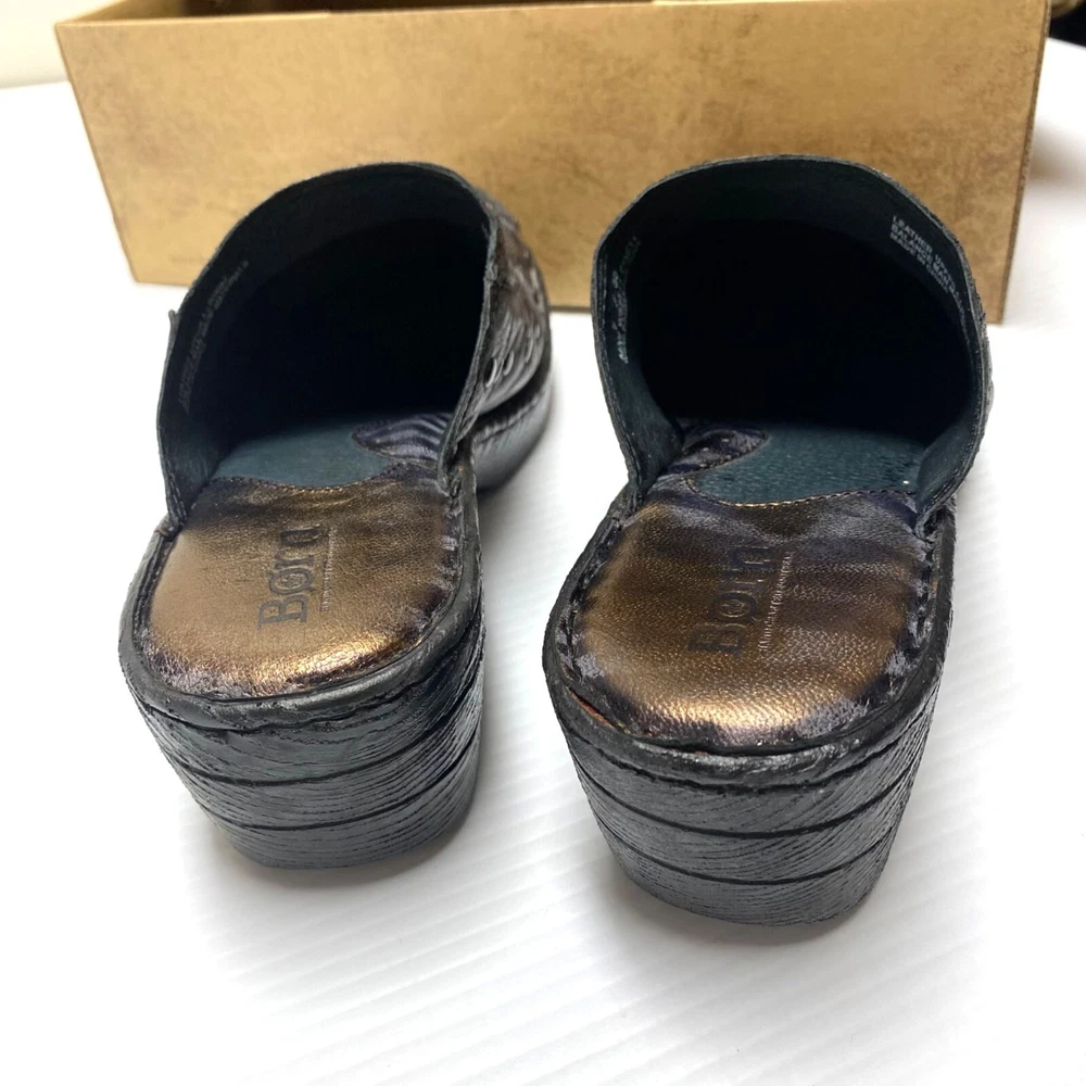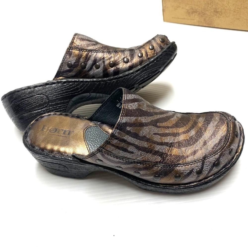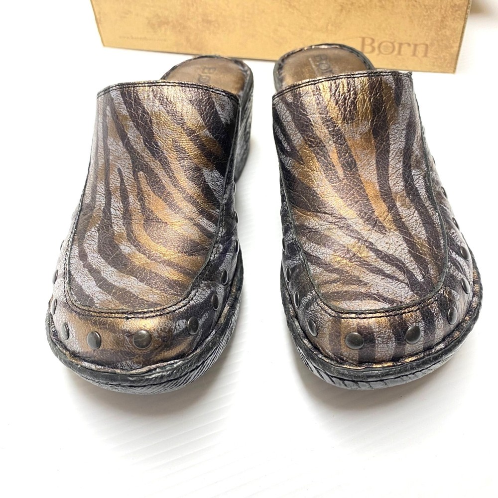 size 7 Born Womens Marley Leather Studded Mules Clogs brown copper zebra Slip-on comfort shoes excellent used condition. come in their original box. born, born clogs, born shoes, born mules, slip on shoes, size 7, born marley, studded, studded shoes, zebra print, zebra shoes, zebra print clogs, zebra clogs, zebra print shoes, size 7 born, born size 7, womens size 7