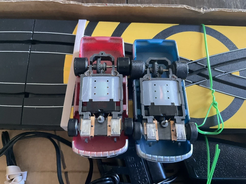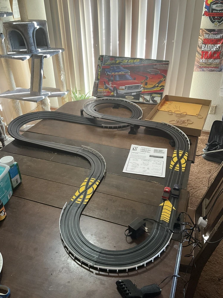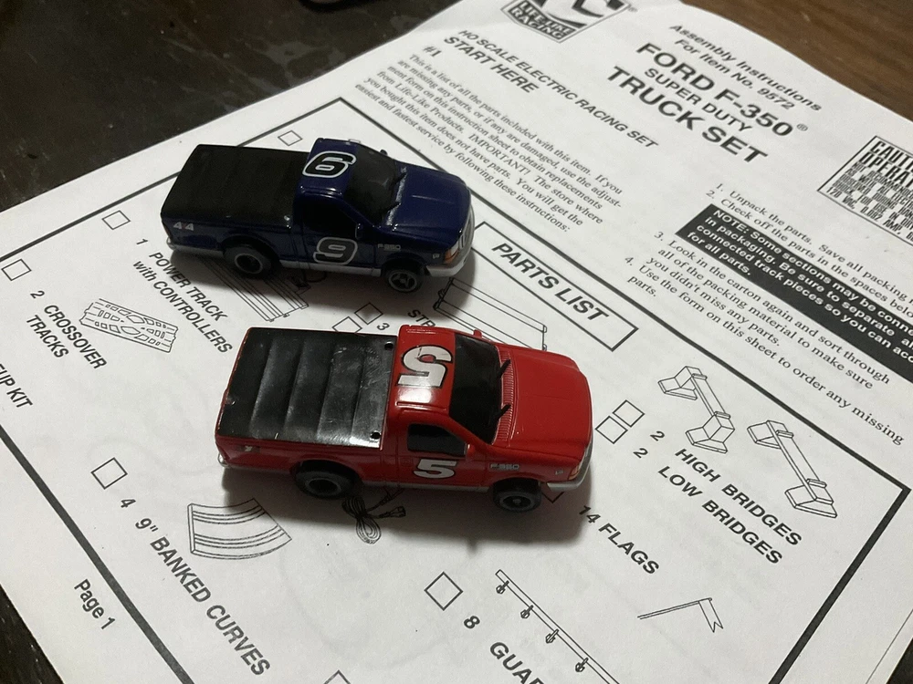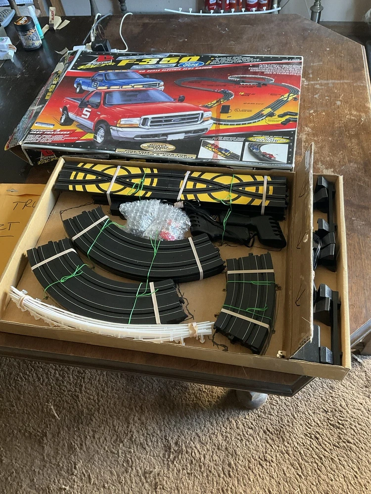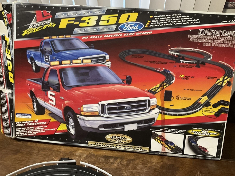 slot car life like ho used F350 super duty racing set…this was all set up and run extensively to insure a ready to race experience for you….it got an A+ rating and is just a really nice set…with two life like, t chassis fast tracker cars featuring to scale speeds reaching an unbelievable 1000 mph…you will be ready to race with this fantastic Slot Car Set! Featuring Ford F350 Super Duty Racing trucks, with easy to assemble instructions, this set is perfect for any car enthusiast looking for a thrilling racing experience. With its high-quality construction and attention to detail, it will be sure to impress with unlimited hours of racing thrills….be sure to click on the “sellers other items “ link, at the bottom of this listing and scroll thru ALL of our other 200+ Ho cars listed here on eBay,today….just quality slot cars and complete, track tested sets with no other crap…you won’t see ALL of them in any other way…so for a quick turnaround and no jerk around, just find the ones you want, throw down the cash and let the fun begin…it’s not that hard..This set is ideal for collectors and racers alike, with its realistic design and fun to use, super fast slot car technology. Whether you're a seasoned pro or just starting out, this set is sure to provide hours of entertainment. So why wait? Order your set today and experience the excitement of “old school” slot car racing with a modern twist..,,over 20 reconditioned sets available today..check it out.. Set c..