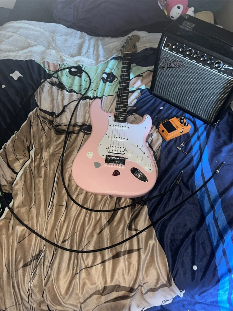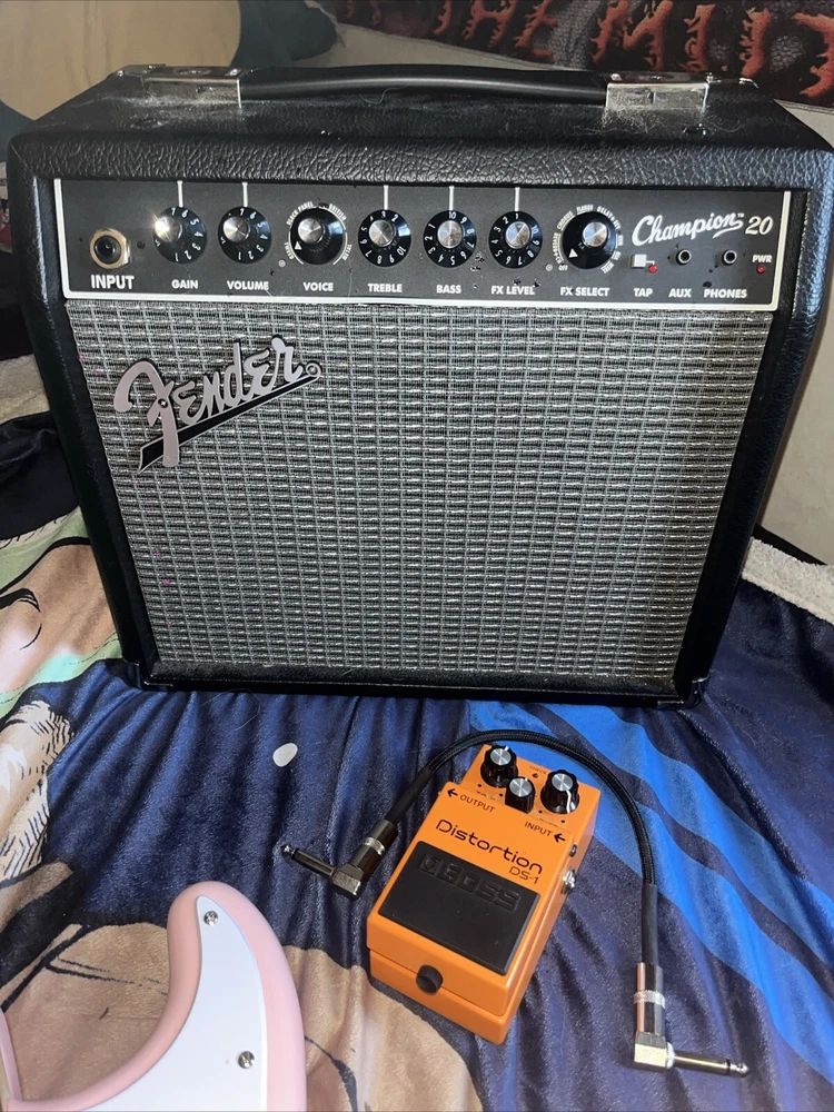 squire stratocaster guitar With Fender Champion 20 Amp And A Boss Ds-1 Pedal