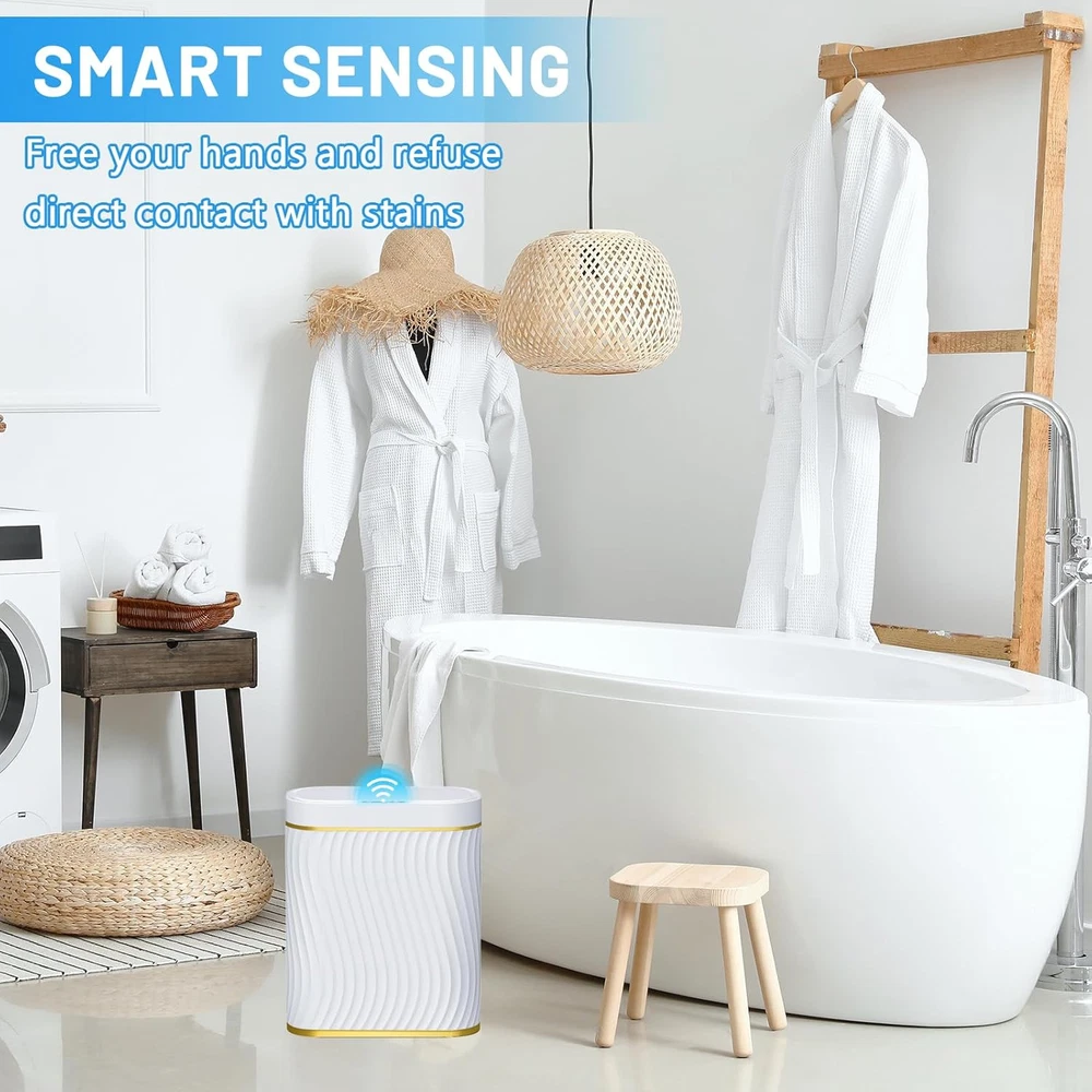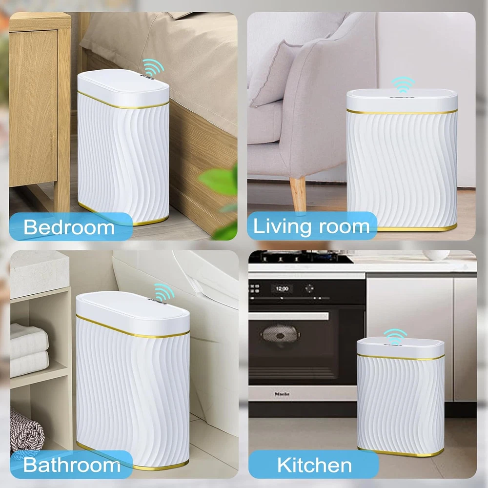 steo spce Bathroom Small Trash Can with Automatic Touchless Lid, Gold White Product Details Product Dimensions : 12 x 6 x 12.2 inches; 2.25 Pounds Item model number : White gold Manufacturer : steo spce Country of Origin : China Brand: steo spce Capacity: 2.6 Gallons Color: Gold White Opening Mechanism: Motion-Sensor Material: Plastic Recommended Uses For Product: indoor Room Type: Bathroom Special Feature: Compact Shape: Oval Finish Type: Polished 【SMART SENSOR TECHNOLOGY】 Our bathroom trash can is equipped with advanced sensing technology, reducing unnecessary openings and extending battery life. Simply place your hand above the infrared motion sensor, and the lid will stay open for your convenience. After 5 seconds of inactivity, the lid automatically closes to conserve energy. (Product powered by 2 AA batteries, not included) 【PERFECT SIZE】Measuring 12.2''L×9.8''W×5.7''H and holding 2.6 gallons, our bathroom garbage can is crafted from durable ABS materials, ensuring long-lasting use. 【WATER-RESISTANT DESIGN】 Thanks to our IPX5 waterproof technology, you don't need to worry about water or humidity damaging the unit. After a quick rinse, the surface remains free of water stains. 【STYLISH & FUNCTIONAL】 Our trash can features a sleek, unique design with novel wave stripes that not only add visual aesthatics but also provide anti-slip functionality. Its modern oval shape makes it a perfect fit for bathrooms, kitchens, and other rooms, optimizing space usage. 【TRASH BAG FIX RING】 The removable trash bag fixed liner ensures that trash bags can hold heavier waste securely. Just place the liner inside and attach a trash bag to keep it discreetly hidden.
