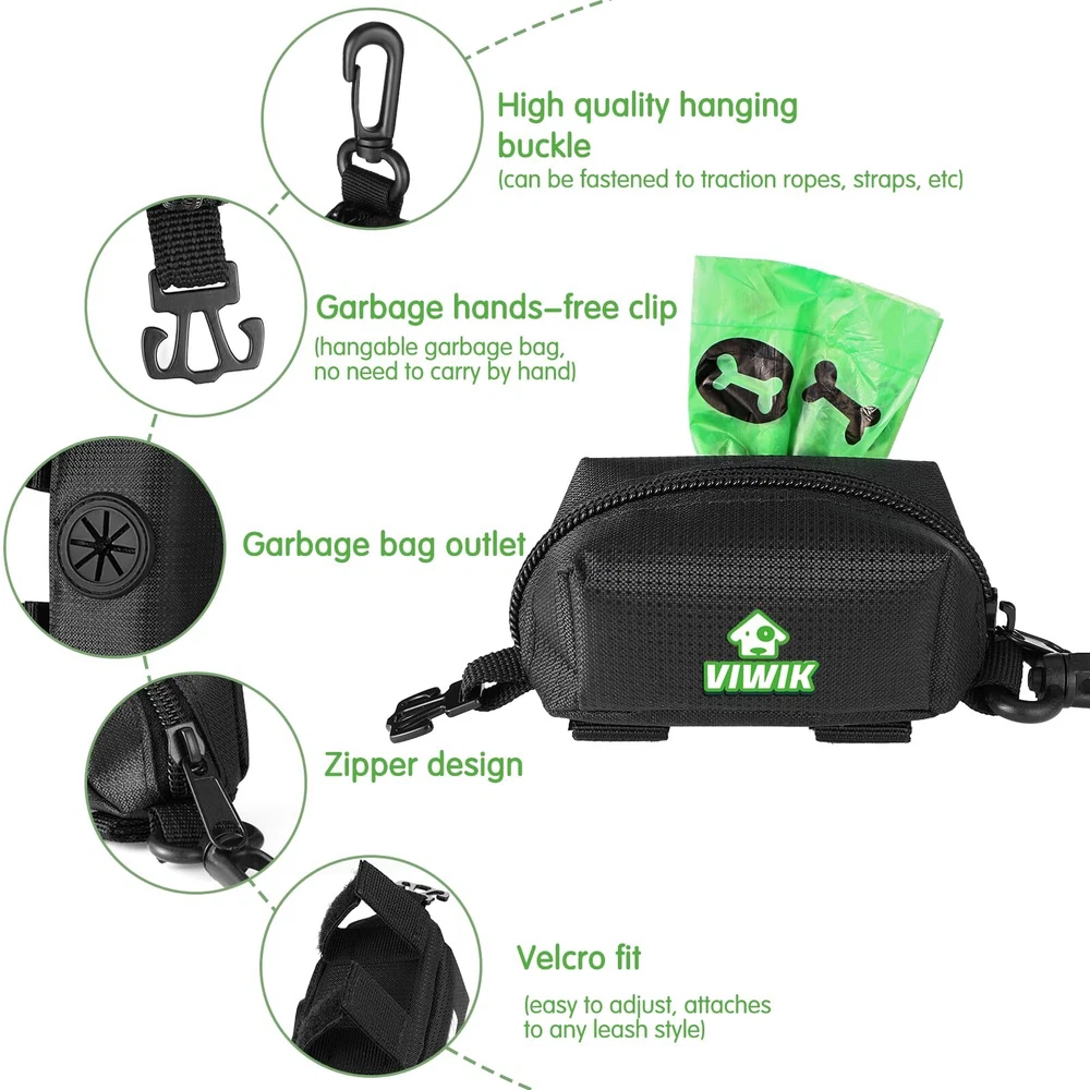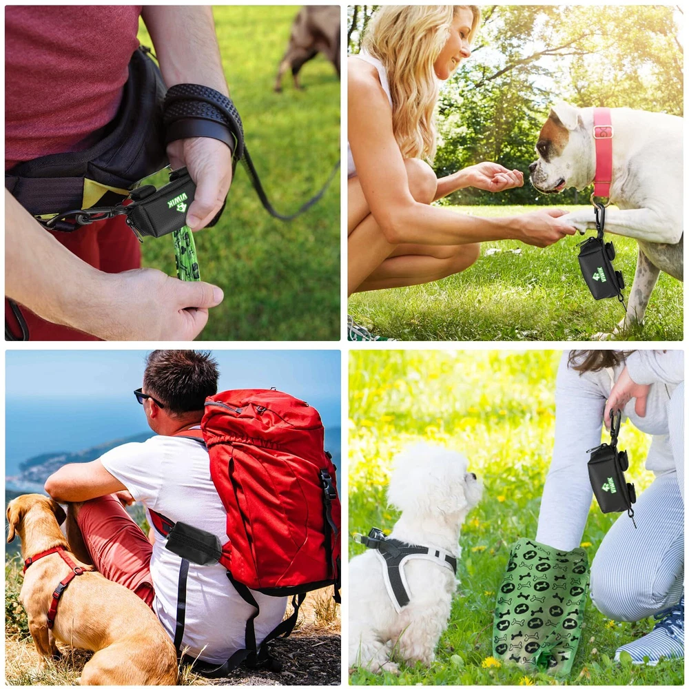 High Quality Dog Poop Bag Dispenser: Our dog poop bag dispenser is made from top-quality oxford fabric that provides enhanced wear resistance and waterproofing. Equipped with a spacious compartment for 1-2 rolls of poop bags, cash, keys, and even dog treats. Outing worry-free while carrying all your essentials in one compact & convenient pouch Convenient Design: Our dog bag dispenser features rubber opening, making it easy to pull out bags one-by-one while keeping the remaining ones securely in place. It adds a touch of fun to your dog-walking routine, It's also a perfect dog lovers gifts for women Hands Free Design: Enjoy a hassle-free walking experience with this dog waste bag dispenser! It frees up your hands from carrying and holding discarded bags. It comes with a separate metal garbage bag carrier that can hold up to two bags at once Easily Attach to Leash: Easily attach this poop bag carrier to any leash or harness with the sturdy climbing buckle and sturdy velcro attachments included - making it a hassle-free way to keep your dog's waste bags handy Compatibility: Fits all standard dog waste bag brands and most roll sizes, including 2.38 x 1.38 inches, 2.5 x 1.25 inches, 2.36 x 1.18 inches, 2.44 x 1.18 inches, etc. Comes with 1 dog poop bag dispenser and a roll of 15 bags for convenience