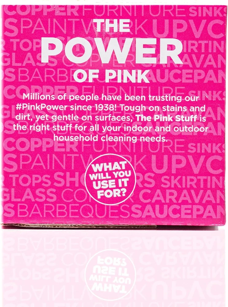 WORKS LIKE A MIRACLE ! -The Pink Stuff paste made cleaning easier like never before, While saving you time, space & money Lasts way longer than any other liquid detergent GREAT FOR ALL SURFACES -Remove stains,Grease or grime from just about anything, Stoves, Kitchen Floors,metal, ceramics, porcelain, marble, wood, silverware, jewelry, glass shower doors, fiberglass doors, glass stove tops, countertops,toilet, sinks, bathtub, car wheels, stainless steel, NO SCRATCHES -Stardrops Paste wont leave any scratches or any streak. Works Instantly -removes stains from Rust, Pen, Marker, Crayons, Paint, Permanent Marker Sparkling streak free shine The Pink Stuff Miracle Cleaning Paste is perfect for cleaning dirt, grime and stains on saucepans, cooker tops, sinks, uPVC, barbecues, ceramic tiles, glass, showers, garden furniture, paintwork, boats, brass and rust... the list is endless.