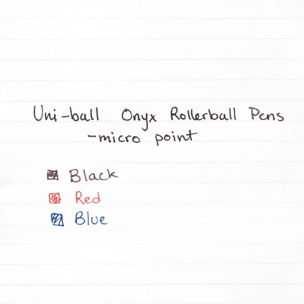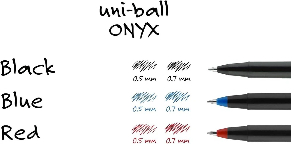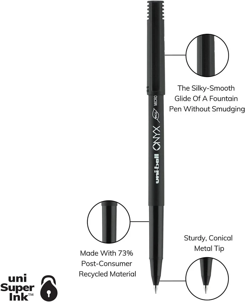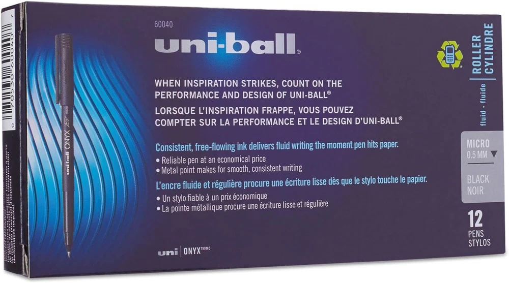 uni-ball 60040 Onyx Roller Ball Stick Dye-Based 12 Count (Pack of 1), Black Product Details Manufacturer: SANFORD Brand: Uni-Ball Item Weight: 3.2 ounces Product Dimensions: 5.8 x 2.8 x 0.9 inches Item model number: Uni-Ball.60040 Color: Black Closure: Snap Pencil Lead Degree (Hardness): HB Material Type: Metal Number of Items: 1 Size: 12 Count (Pack of 1) Point Type: Micro Ink Color: Black Manufacturer Part Number: 60040 Brand: Uni-Ball Writing Instrument Form: Roller Ball Pen Color: Black Ink Color: Black Age Range (Description): Adult Sold as 1 Dozen. Excellent for carbons and multi-part forms. Easy to hold matte black barrel. Liquid ink. Features acid-free and archival quality roller ink, which is useful for important documents that need to last. Create crisp, smooth lines with uni-ball Onyx Rollerball Pens. Ideal for creating carbon copies, these rollerball pens feature matte black barrels and slim metal tips for precision. Consistent, free-flowing ink delivers fluid writing the moment pen hits paper. Point Size: 0.5 mm; Point Type: Micro; Ink Color(s): Black; Pen Type: Roller Ball.