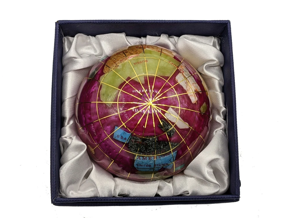 This unique Pink gemstone globe paper weight is brand new, It is painstakingly put together all by hand, using a variety of semi-precious gemstones from all over the world! The Oceans are made of pearl swirls (it was very complicated and expensive procedure, precise control of temperature is the most essential factor in the processing cycle). This is a huge amount of striking and dramatic hand-crafted stone work. 3" Diameter Gemstone Globe Paperweight Highest quality Gemstones are used Ocean Part made of Pearl powders