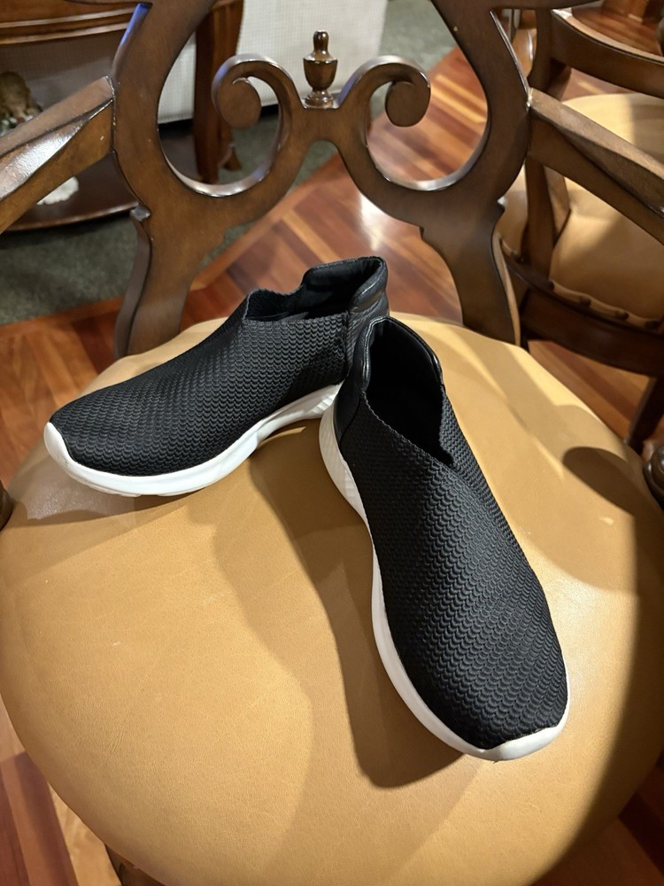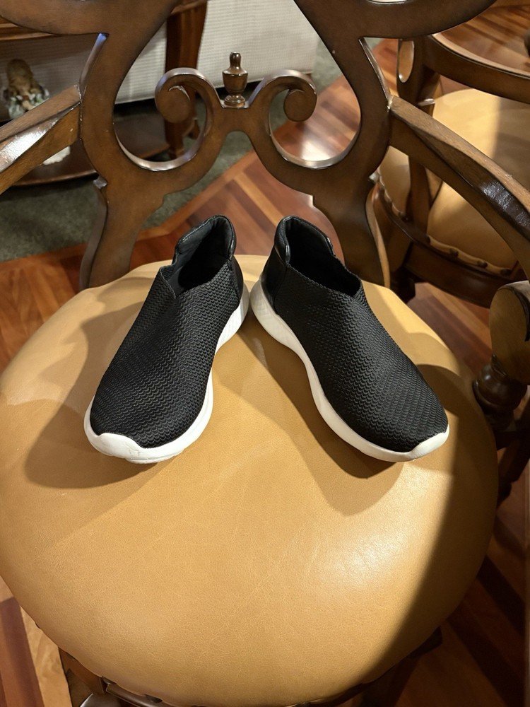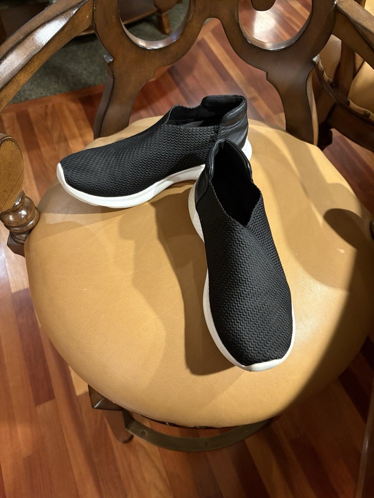 Vaneli Sport Black Slip on Shoes. Size 7.5 In good condition. Comfortable shoes. No tears or flaws. Leather heels with Fabric (polyester) on remainder of shoe.
