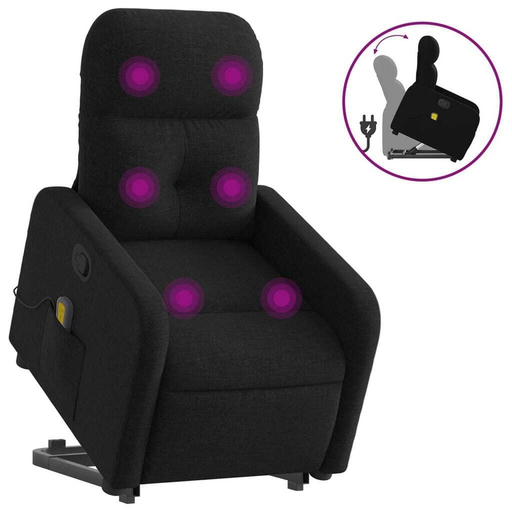 Sit back and drift away in this highly comfortable stand up massage recliner chair! Power lift function: This recliner chair for the elderly is equipped with an electric motor for the lifting-up function. Thanks to the function that pushes the entire chair up, you can easily stand without stressing your back and knees with a simple press of the button. Manual reclining function: This reclining chair has a handle on the right side. You can manually adjust the footrest and the backrest to any position as per your comfort with a simple pull of the handle. This feature allows for a maximum tilt of 135 degrees. Additionally, the backrest can go quickly back to the original place with an easy pull of the handle. Vibration function: The featured 6 massage points let you experience a better-targeted massage. Additionally, the included hand control allows you to pick different massage programs. The massage function is powered by the USB connector that requires a certified 5V USB power source (not included). Comfortable seat experience: The thickly padded seat, backrest, and wide armrests covered in the fabric provide a cozy and warm sensation, making you feel embraced while seated. The fabric features a simple and clean look and is breathable and durable. Convenient side pocket: This armchair has a side pocket for your remote control or keeping your essential items within easy reach. Solid and stable frame: The frame made of wood and metal provides a strong structure and stability. This reclining armchair is comfortable and durable. Color: Black Material: Fabric (100% polyester), metal, plywood Filling material: Foam, pp fiber Sitting up dimensions: 26" x 35" x 37.8" (W x D x H) Lying down dimensions: 26" x 56.7" x 30.5" (W x D x H) Seat width: 19.7" Seat depth: 21.9" Seat height from the ground: 16.5"-17.5" Armrest height from the ground: 21.9" Options: Massage without heating Type of massage: 6-point vibration massage Input voltage: DC 5 V Input current: 2 A With an electric motor for automatically stand-up function Electric motor input: DC 24 V, 1.5 A Electric motor output: 100-240 V~, 50-60 Hz Max. load capacity: 242.5 lb Assembly required: Yes California Proposition 65 WARNING: California's Proposition 65