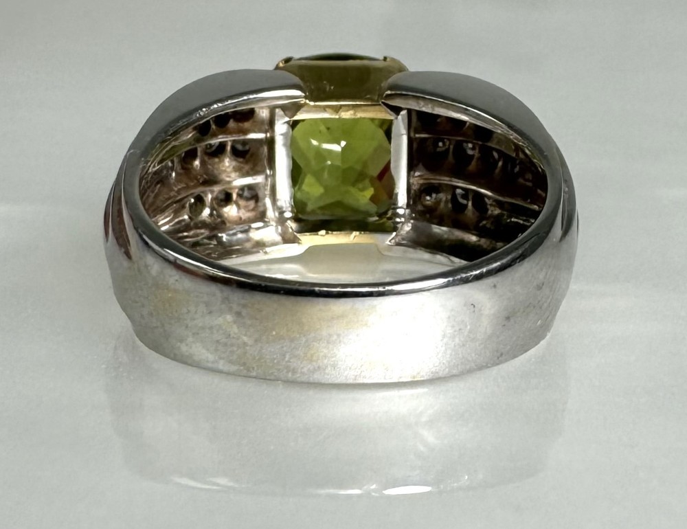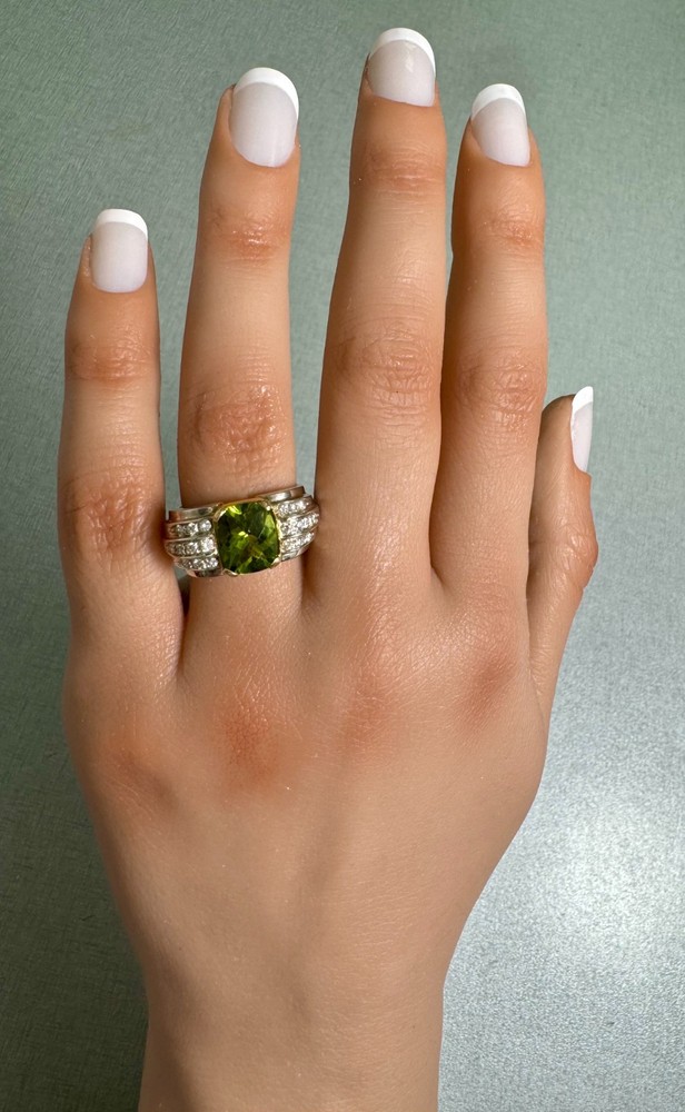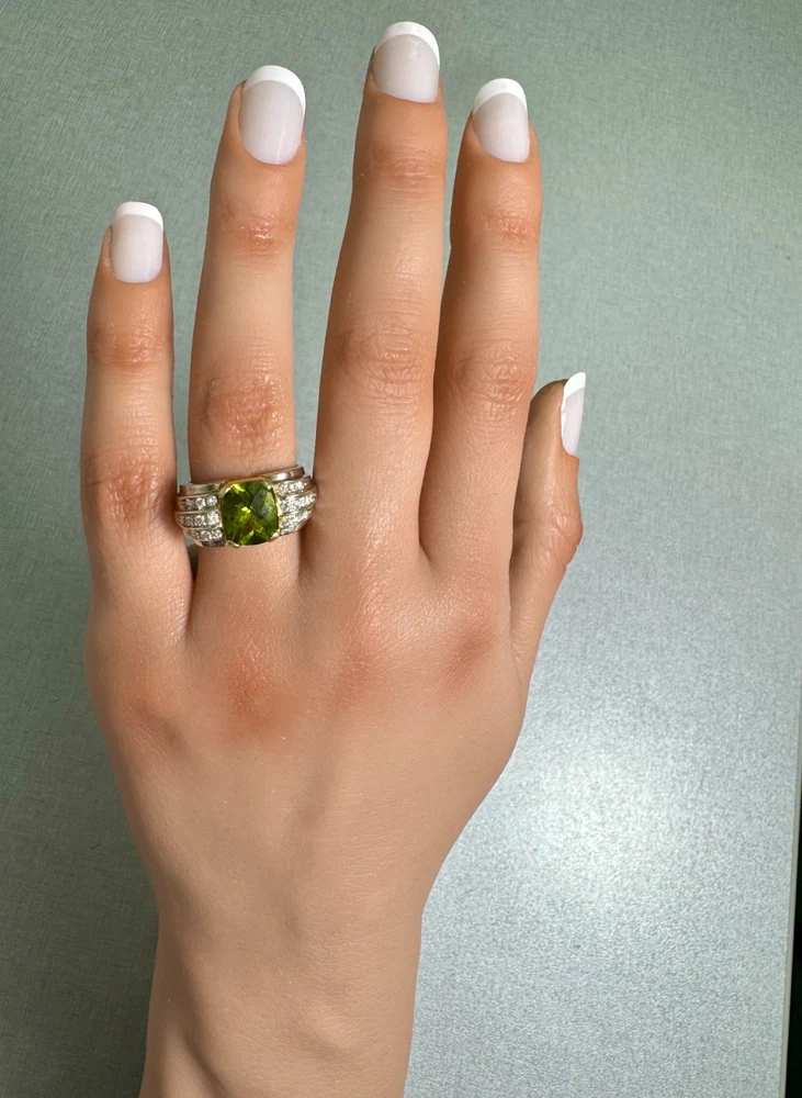 This vintage 18k yellow gold peridot ring features a cushion-shaped green peridot as the main stone, accented with a diamond on the secondary stone. The ring is crafted with natural gemstones and has a total carat weight of 2.90, set in a prong setting style. With a ring size of 7.75, it is a beautiful piece of fine jewelry that exudes nature, love, and healing themes, making it a unique and stunning addition to any jewelry collection. *Ring size: 7 3/4 US *Ring weight: 10.49 Grams *Center stone dimensions: 9.7X7.7mm