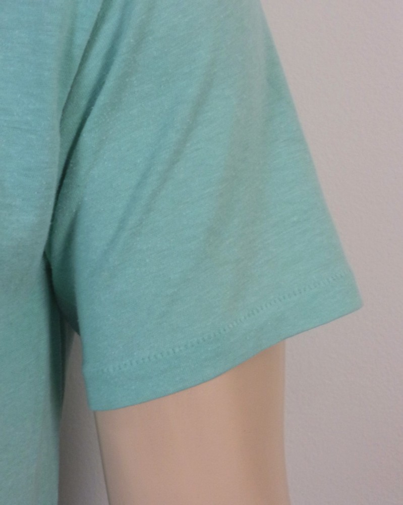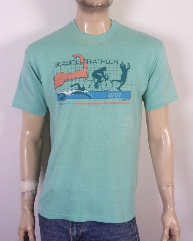 The vintage 1987 Seaside Triathlon T-Shirt Napoli Garden in size L is a graphic print shirt with a crew neck and short sleeves. Made from a cotton blend material, this thin and soft shirt is machine washable and features a light pale blue/green color. Perfect for any season, this unique tee captures the 80s vibe with its distressed look and triathlon theme from the 1987 Napoli Gardens Seaside Triathlon. The regular fit and size make it a great addition to any man's wardrobe, representing a piece of history from the United States. Beautiful true vintage single stitch tee, distressed and worn but with no dealbreaking flaws that are eye sores. It has a small little sleeve seam split, very tiny, see pics. Aside from that considering the heavily worn/thin/distressed nature of the fabric, it has pretty minimal specific flaws.