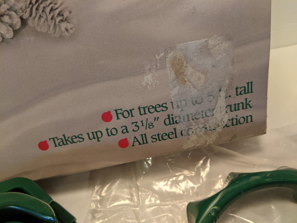 vintage METAL CHRISTMAS TREE STAND National Metal Industries Made in USA #5119 For trees up to 5 feet tall Takes up to a 3-1/8 inch diameter trunk All steel construction Red and green Lead free paint 20 inch leg spread for stability Bowl for holding water to keep your tree fresh throughout the season Instructions on the back of the box No tools needed for assembly