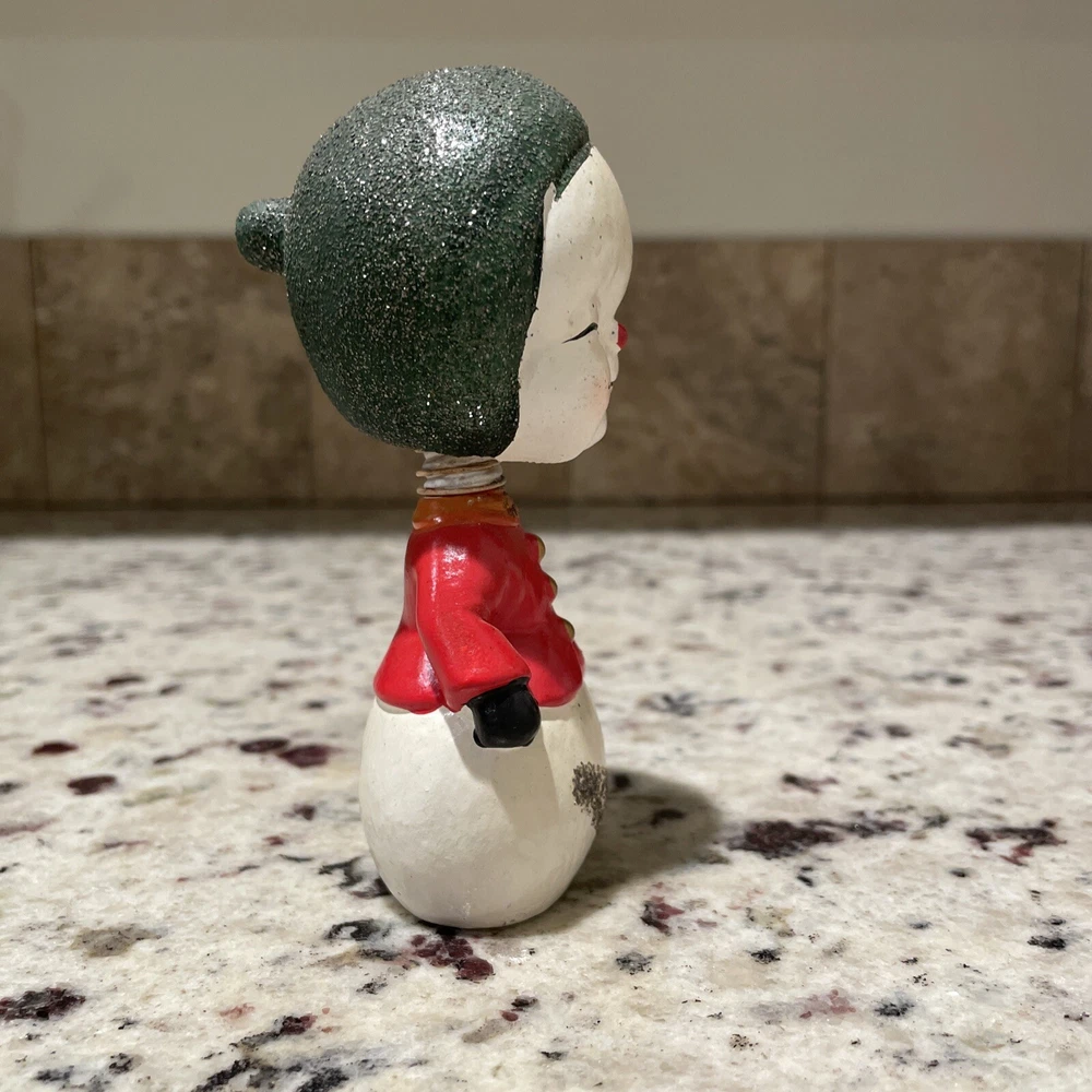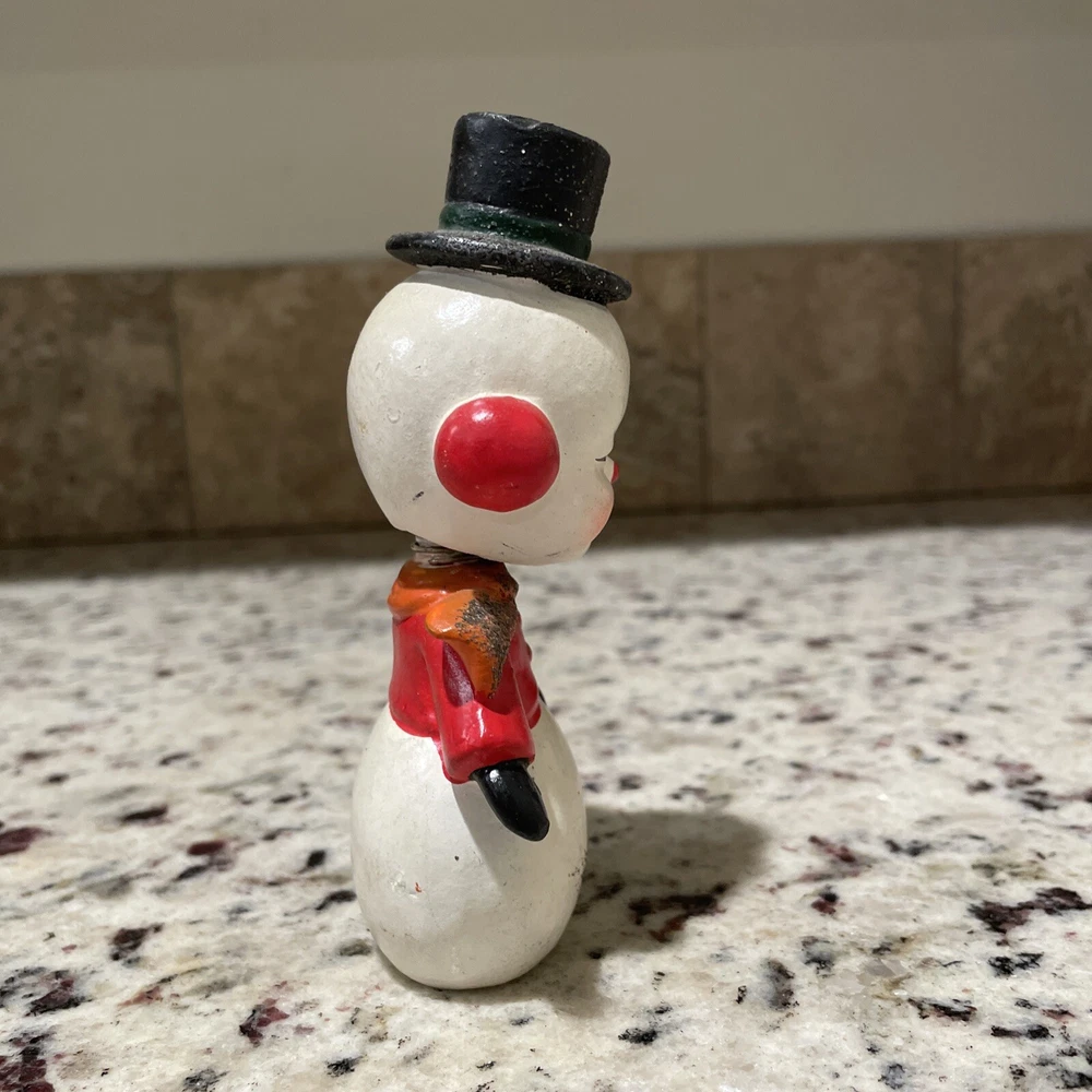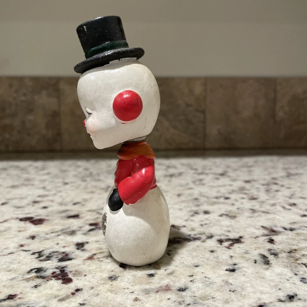 Vintage snowman and woman great condition bobbleheads nodders. Snowman has top hat with scarf gloves and coat. Snow woman has a head scarf, neck scarf, coat, gloves, and a basket. Small paint loss on snow woman’s scarf. See pics The snowman does have a slight lean to his head. Snowman is 5 inches tall and the snow woman is 4 3/4 inches tall . I am unsure of the material it is made from . Small manufacturers imperfections on swim woman’s face paint speckles and excess material on her lip. Snowman imperfections paint speckles and small pot on top hat where paint has come off. The year 1959 is written beside the Japan sticker.