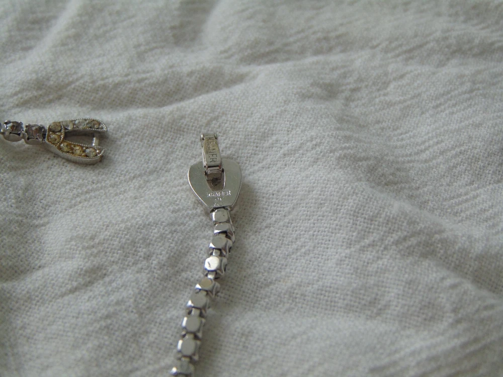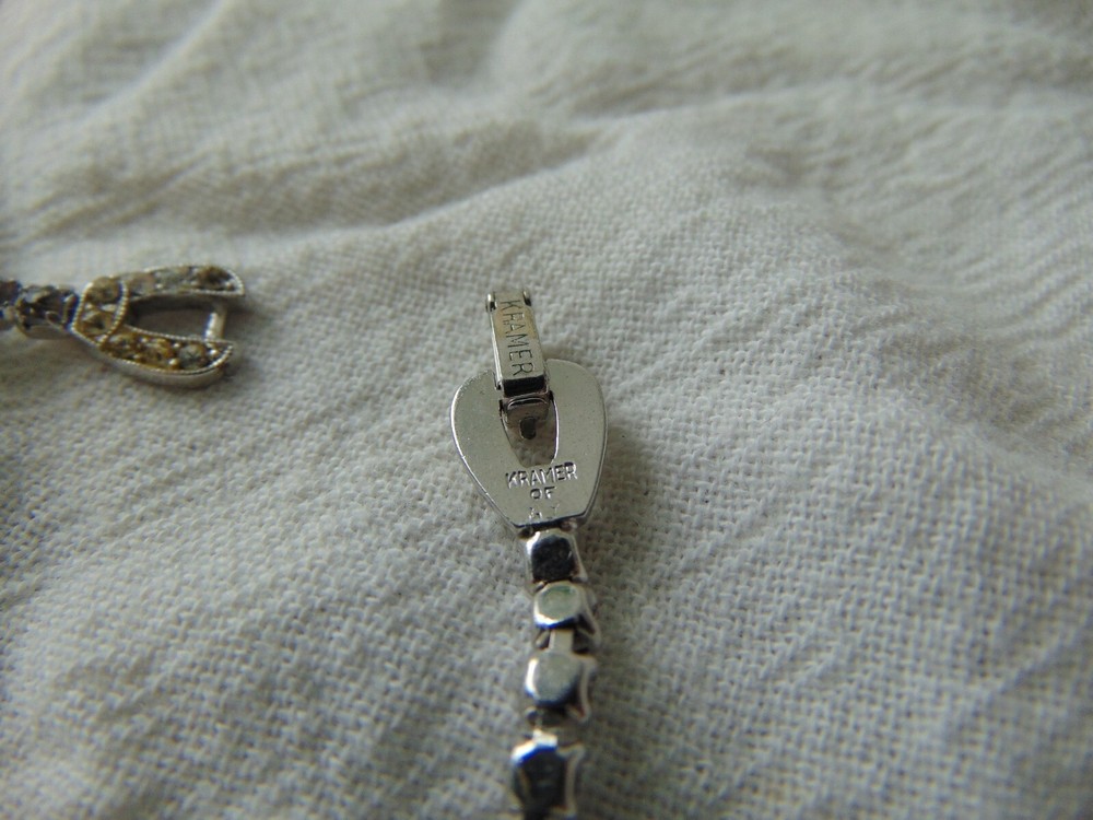 16 inches long, signed Kramer of New York on back of clasp. has several discolored rhinestones but still sparkling. jewelled clasp.