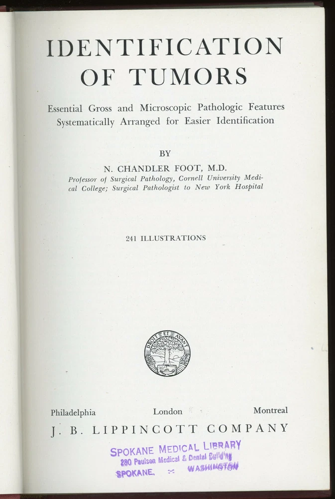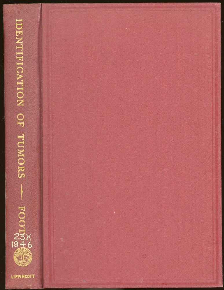 Vintage Medical: IDENTIFICATION OF TUMORS by N Chandler Foot. Printed 1948. Published by J N Lippencott Co, Philadelphia. 6 1/4 inches wide by 9 1/4 inches tall. Red cloth covers with gold stamping on spine. 397 Pages. 241 illustrations, mostly b&w micrographs. Condition: Ex-library: white inking on lower spine, library stamping on the upper page edges and on the title page, penciled seller notes on copyright page. The covers show light shelf wear: spine edges rolled, outer corners not bumped, light soiling on the page edges, light foxing on the long page edges; no remaindering marks. Inner pages are clean, tight, and (outside of the library markings) unmarked. Money back upon return if not satisfied or any problems with shipping within the US. Due to changes at the US Postal Service, we can no longer guarantee delivery on international mail. Thanks for looking. International Buyers – Please Note: Import duties, taxes, and charges are not included in the item price or shipping cost. These charges are the buyer's responsibility. Please check with your country's customs office to determine what these additional costs will be prior to bidding or buying. 12/23/19 2/2