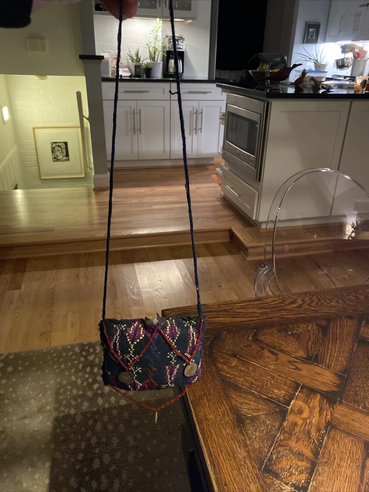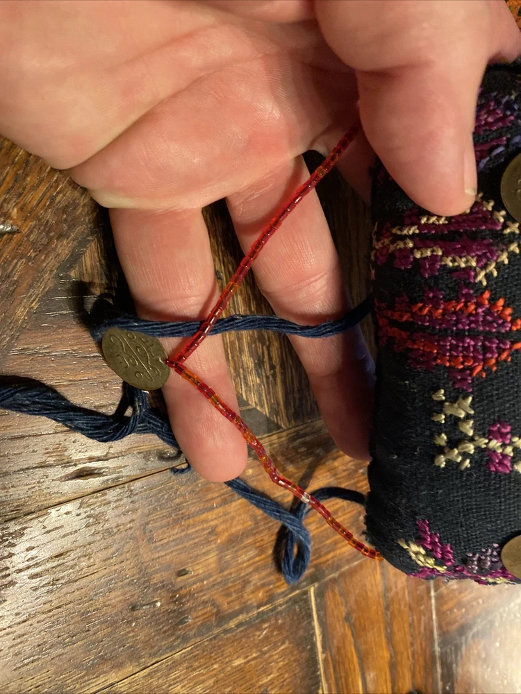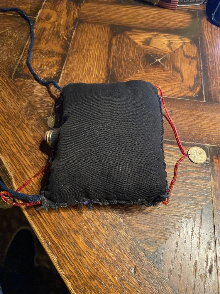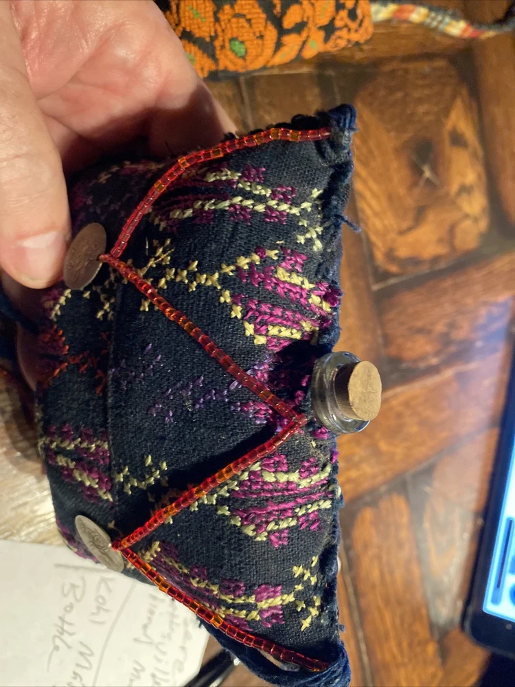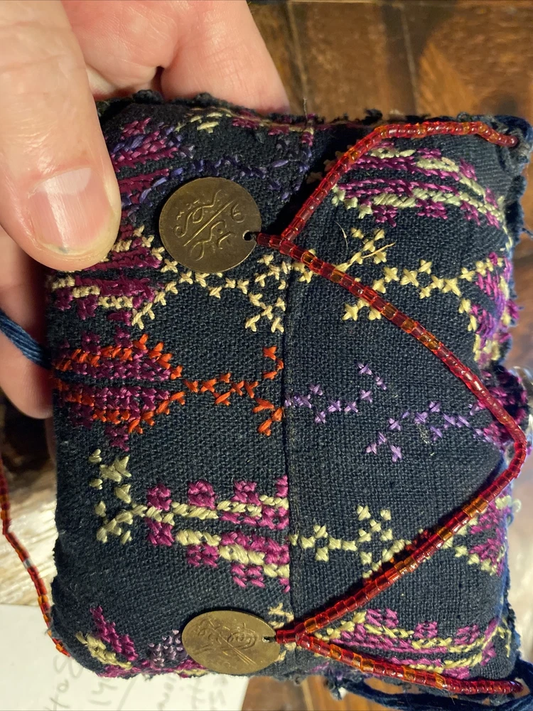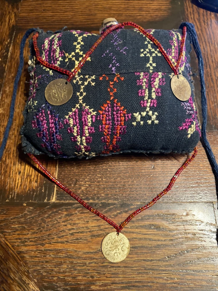 vintage Middle Eastern hand embroidered PERFUME scent BAG textile, with beaded coin like detail, 4 1/2” x 4 1/2”, has some wear but good condition.