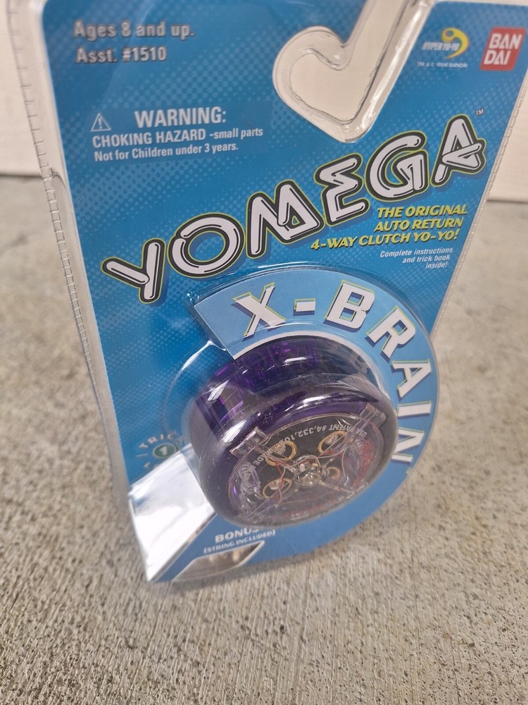 The vintage Yomega x-brain yoyo in purple is a classic toy from 1999, featuring the innovative design of Yomega. This yo-yo is known for its unique X-Brain shape and is a sought-after collectible item for toy enthusiasts. With its vibrant purple color and nostalgic appeal, this Yomega yoyo is sure to bring joy to both children and adults alike.