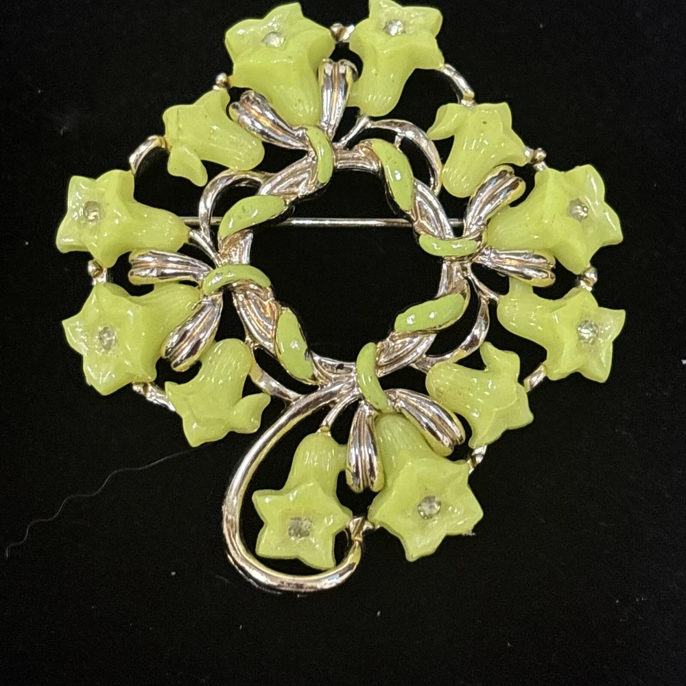 Add a touch of vintage charm to your outfit with this beautiful flower brooch. Crafted from gold-tone metal, this brooch features a lovely green color that will complement any outfit. Measuring at 2 inches in length, this brooch is perfect for any occasion, whether it be a birthday, anniversary, christening, or even Christmas. The brooch is designed in the shape of a flower and features a stunning green main stone color. The plastic material adds a unique touch to the brooch, making it a perfect addition to your vintage jewelry collection. This brooch is perfect for anyone who loves vintage jewelry and wants to add a touch of elegance to their outfit.