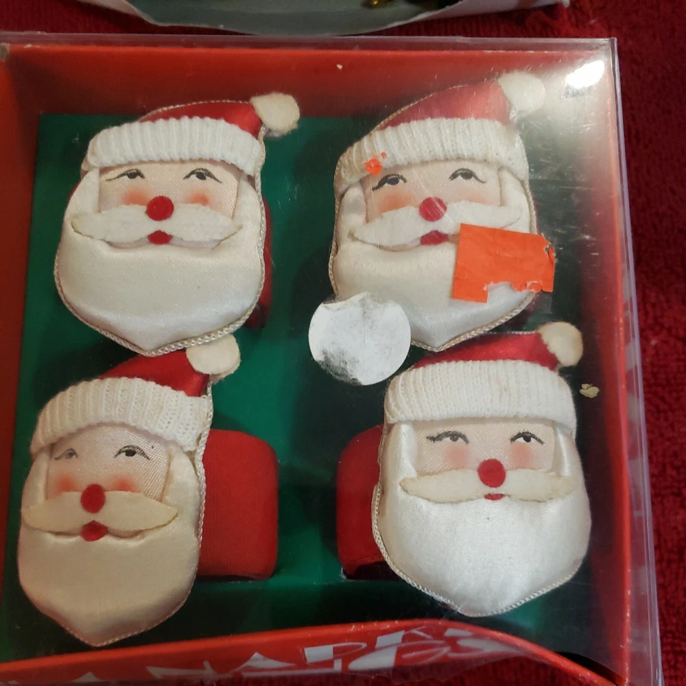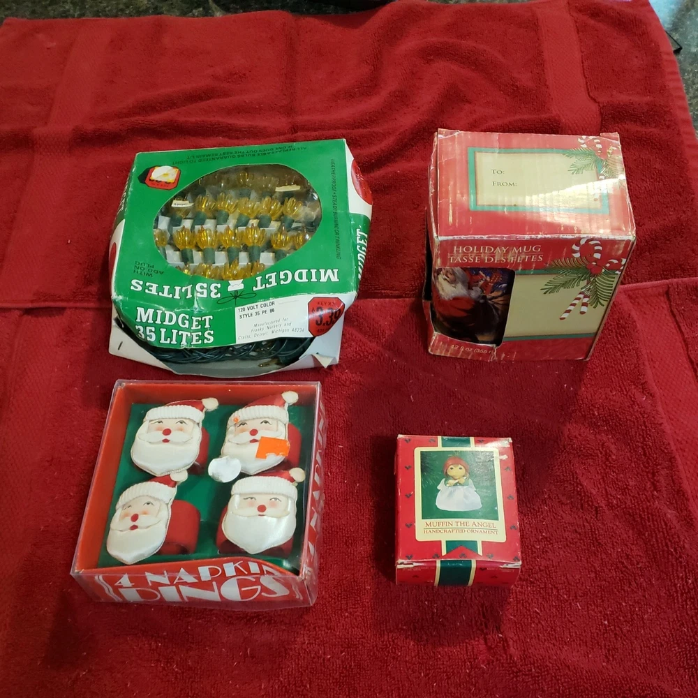 Get into the holiday spirit with this vintage Christmas decorations lot! It includes a midget light for adding some cozy ambiance, a Santa napkin ring to dress up your table, and a festive Santa cup for sipping on your favorite holiday drinks. Perfect for collectors and anyone looking to add some vintage charm to their holiday decor. Get ready to spread some Christmas cheer with these unique and fun decorations.