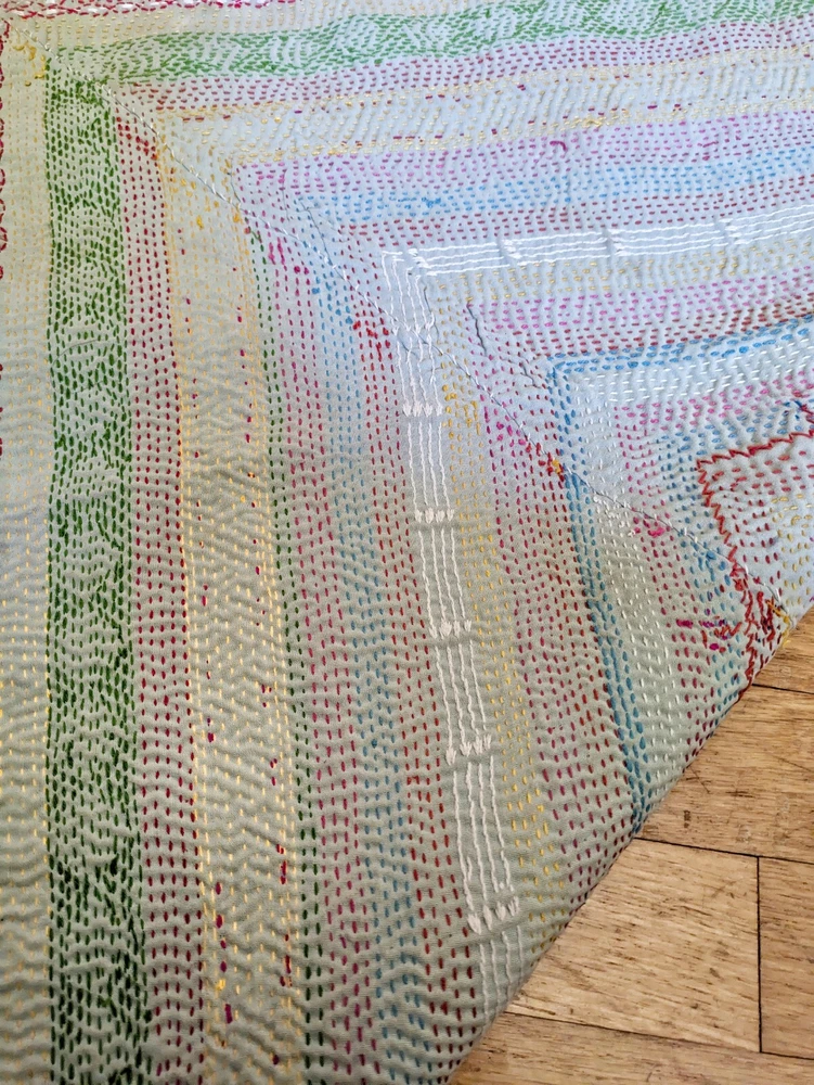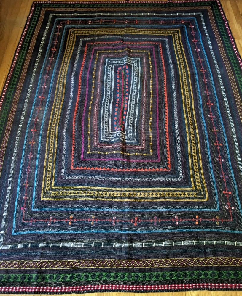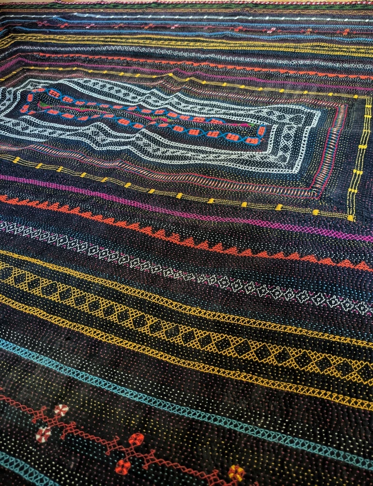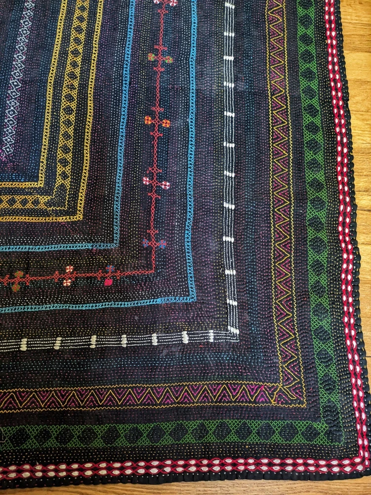 Add a touch of vintage charm to your bedroom with this beautiful handmade coverlet. The black Kantha quilt features a geometric pattern and is made of 100% cotton, ensuring both comfort and durability. Measuring 90 inches in length and 66 inches in width, this queen-sized bedspread is perfect for any bedroom. This coverlet is a unique addition to any bedding collection and is sure to impress. It is quilted and features a stitch character, adding a touch of whimsy to your decor. Dry clean only to maintain its quality. Made in Pakistan, this coverlet is a must-have for anyone looking for a stylish and comfortable bedspread. Please message if you need further information.