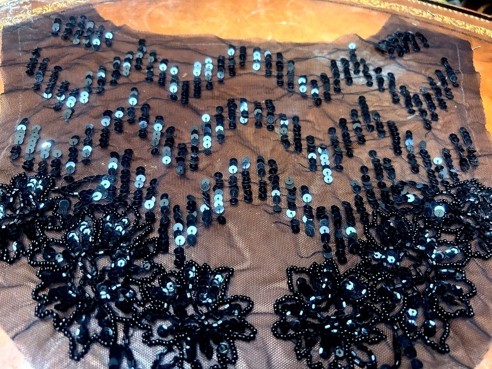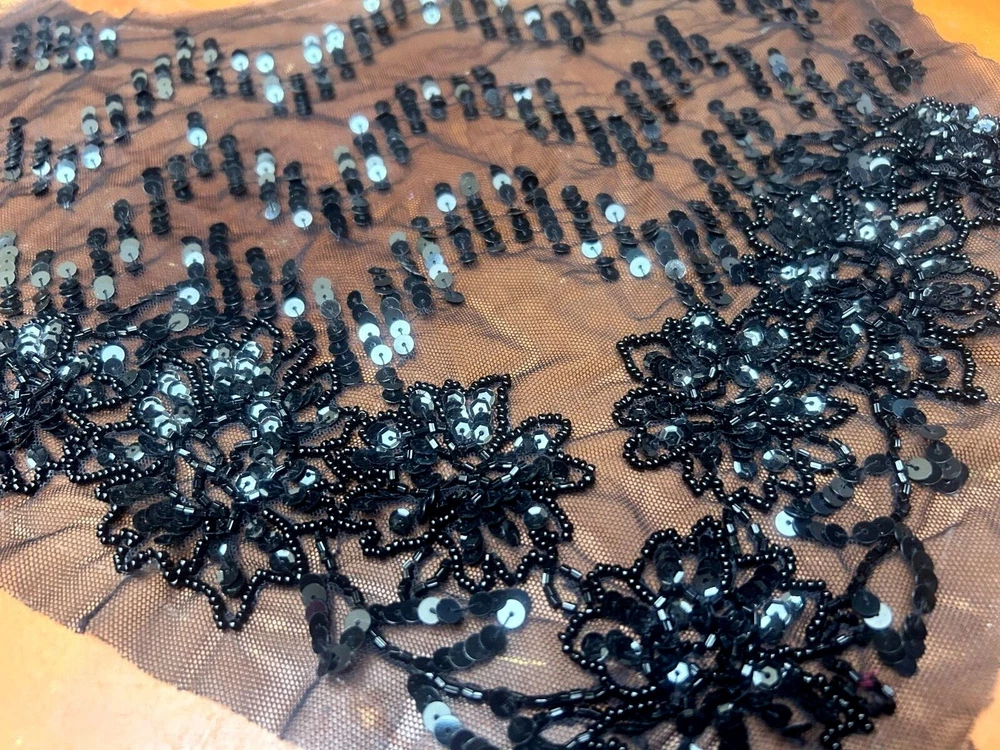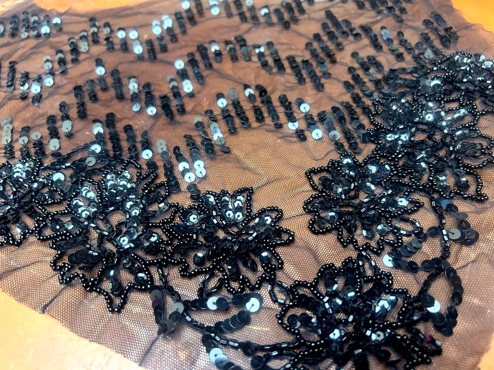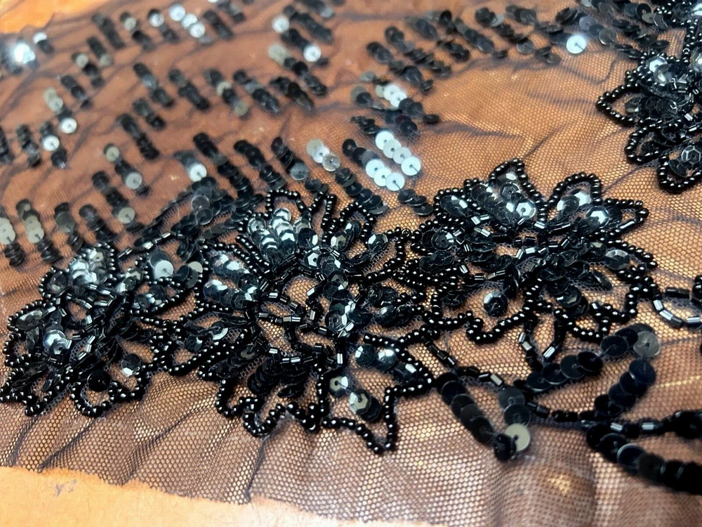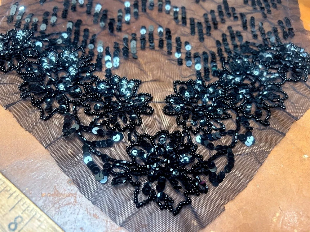 vintage panel beaded netting 1pc flowers hand sewn black Studio Clearance Sale