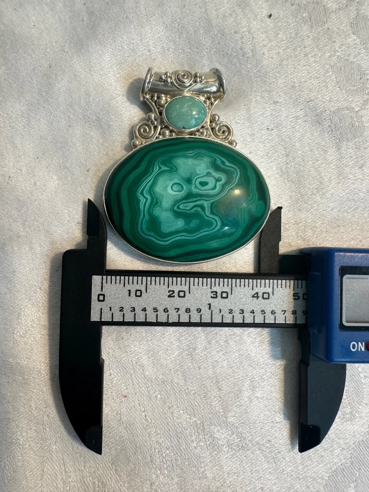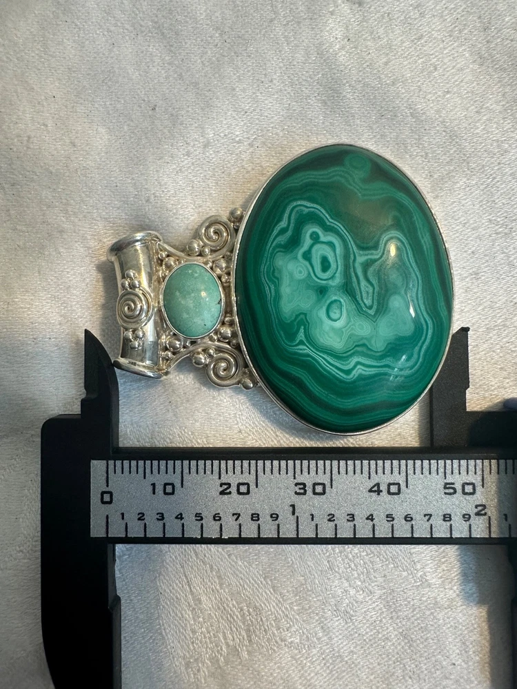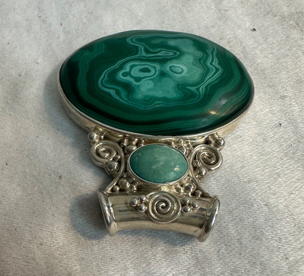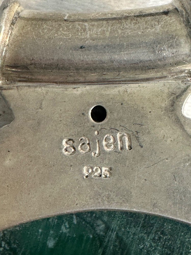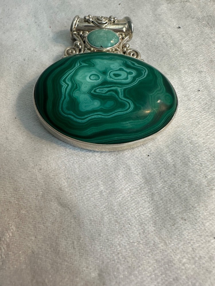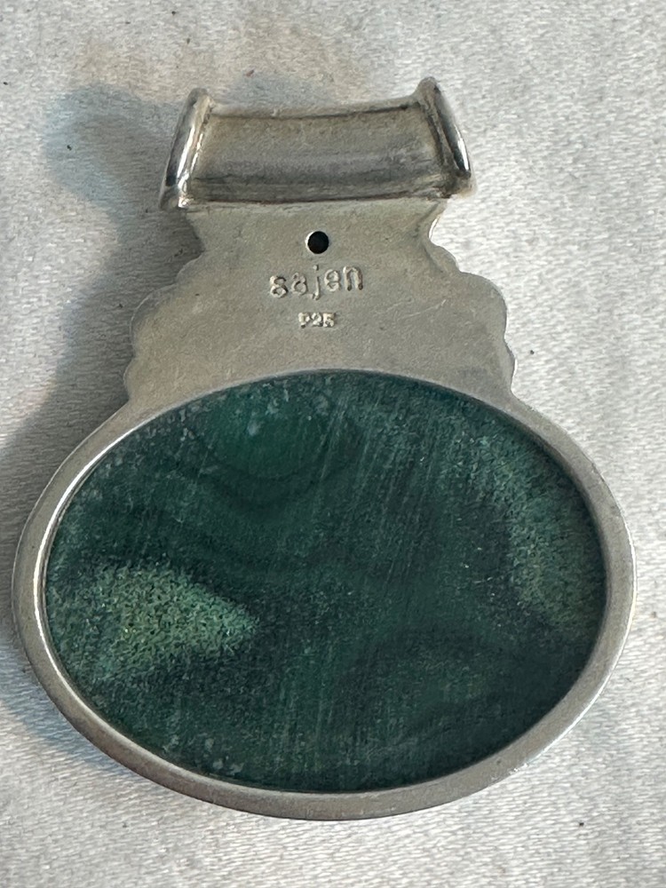 This vintage Sajen sterling silver pendant features a beautiful Malachite stone set in a bezel setting. The pendant also includes an Amazonite stone as a secondary gemstone, adding a unique touch to the piece. Handmade in Indonesia, this pendant showcases a classic style with a sterling silver base metal and a 925 metal purity. With its oval-shaped main stone and green color, this pendant is a stunning addition to any jewelry collection, signed by the brand Sajen for authenticity.