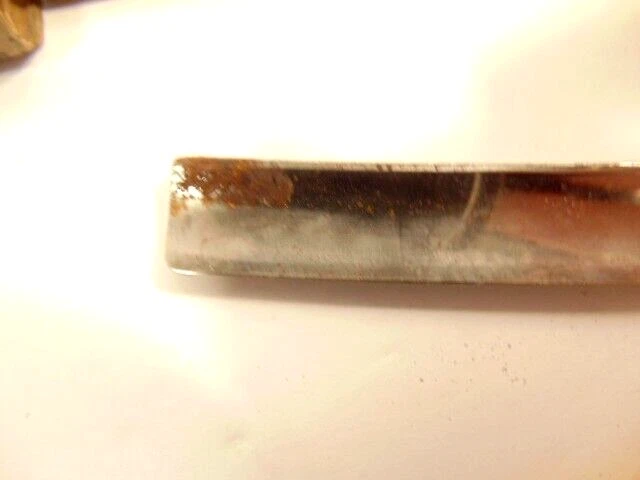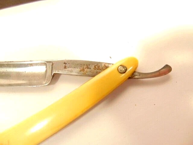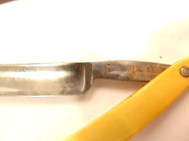 Here is a vintage straight razor marked A. Clauberg, New York, Made in Germany. On the opposite side it shows a brand name or type of razor but some lettering is obscured "Tonscrial Sen.." The razor measures about 6 1/8th inches long. The blade itself measures about 5 1/2 inches from end to end and is about 9/16th inches wide. The razor is in overall sound condition but has some dirt, spots of corrosion and initials on the handle, and other signs of wear and use. The box is not original with the razor. Please see the pictures and ask any questions. Thank you for looking. (Inv A24,453)